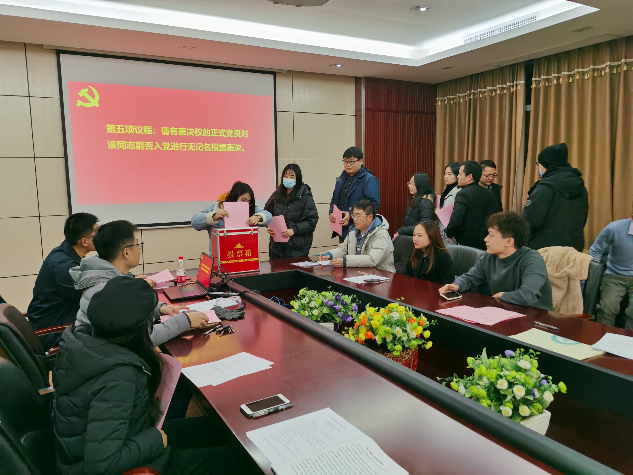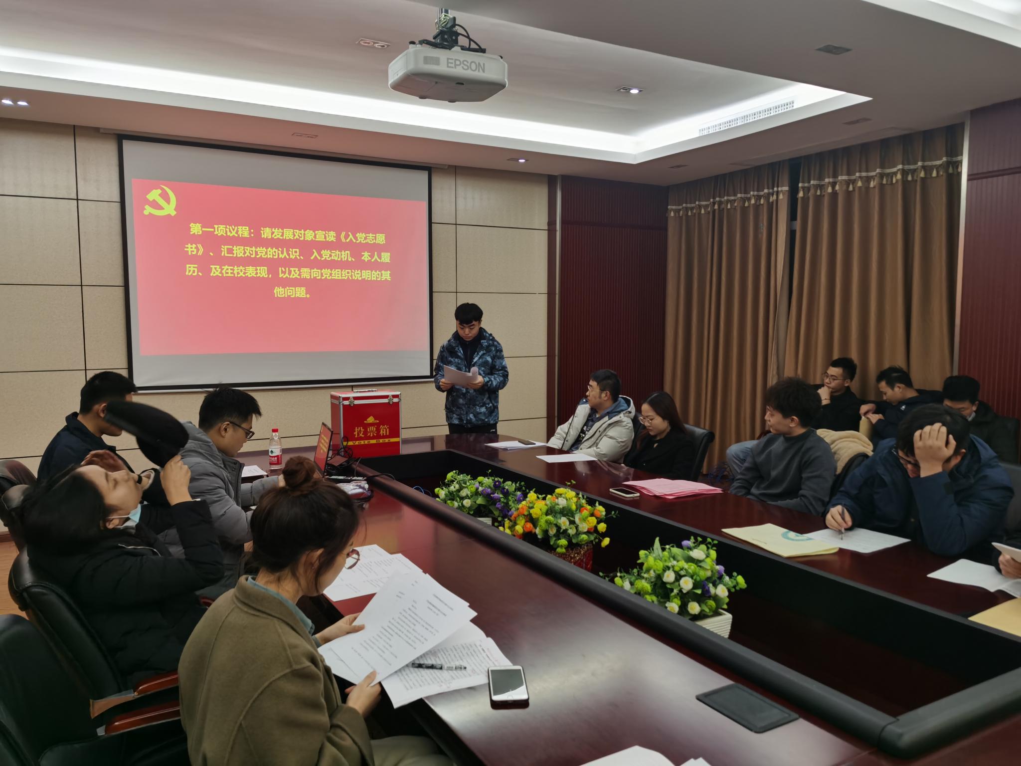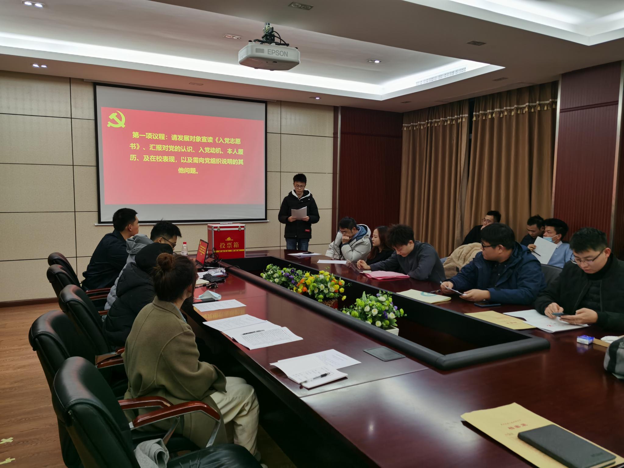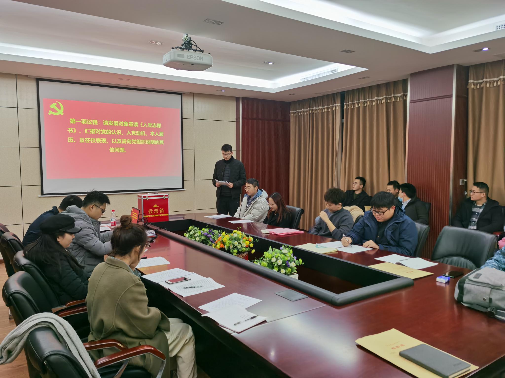 320会议室召开了讨论接收预备党员的支部大会,该会由本支部组织委员石昊同志组织,讨论表决发展对象赵立坤、王智成、杨静波、姜宇奇、唐诗琴、胡天怡六名同志的入党问题。本次会议由本支部党员以及发展对象一同参加,其中应到会正式党员28名,应到预备党员0名,实到会正式党员19名。