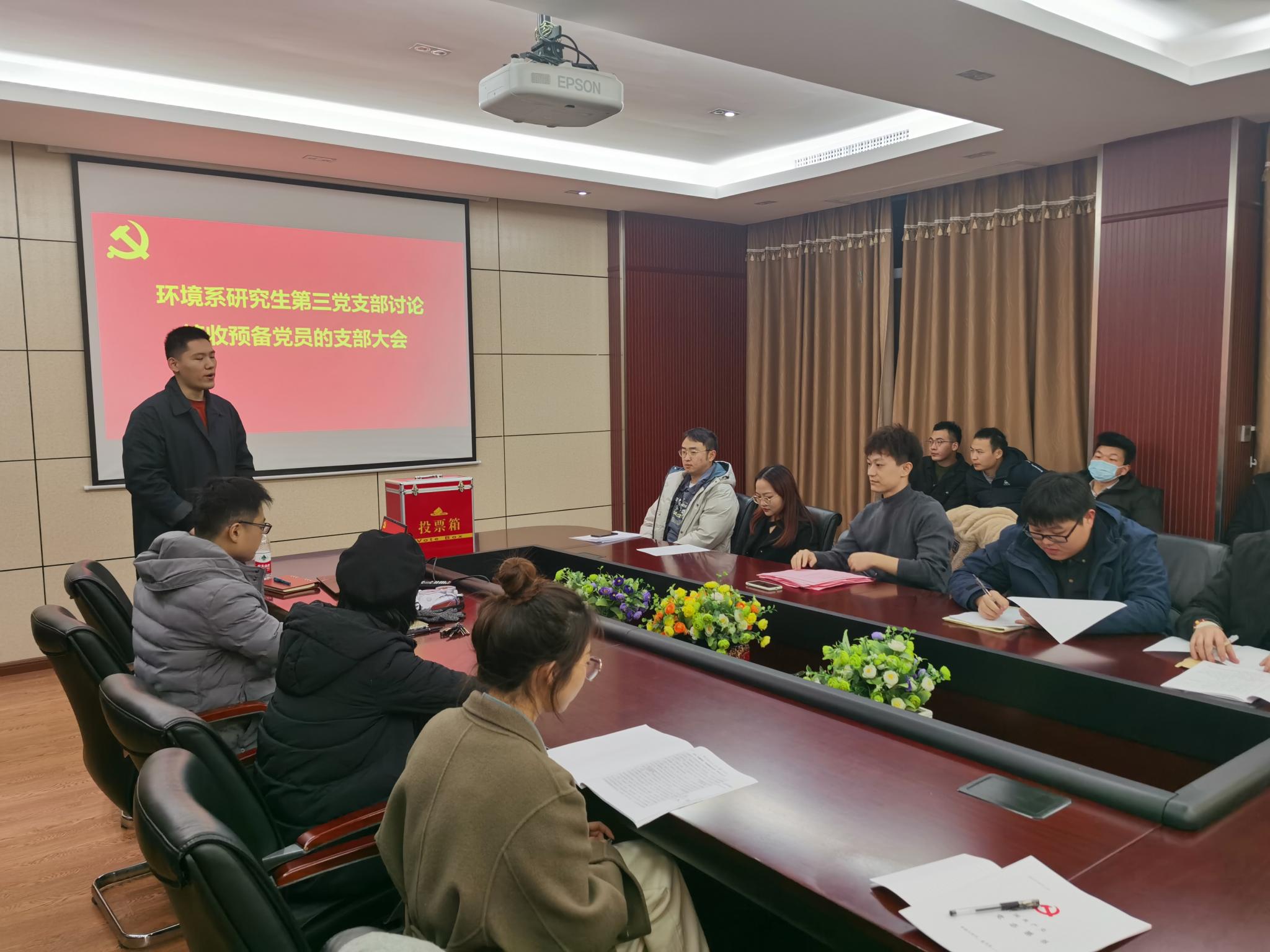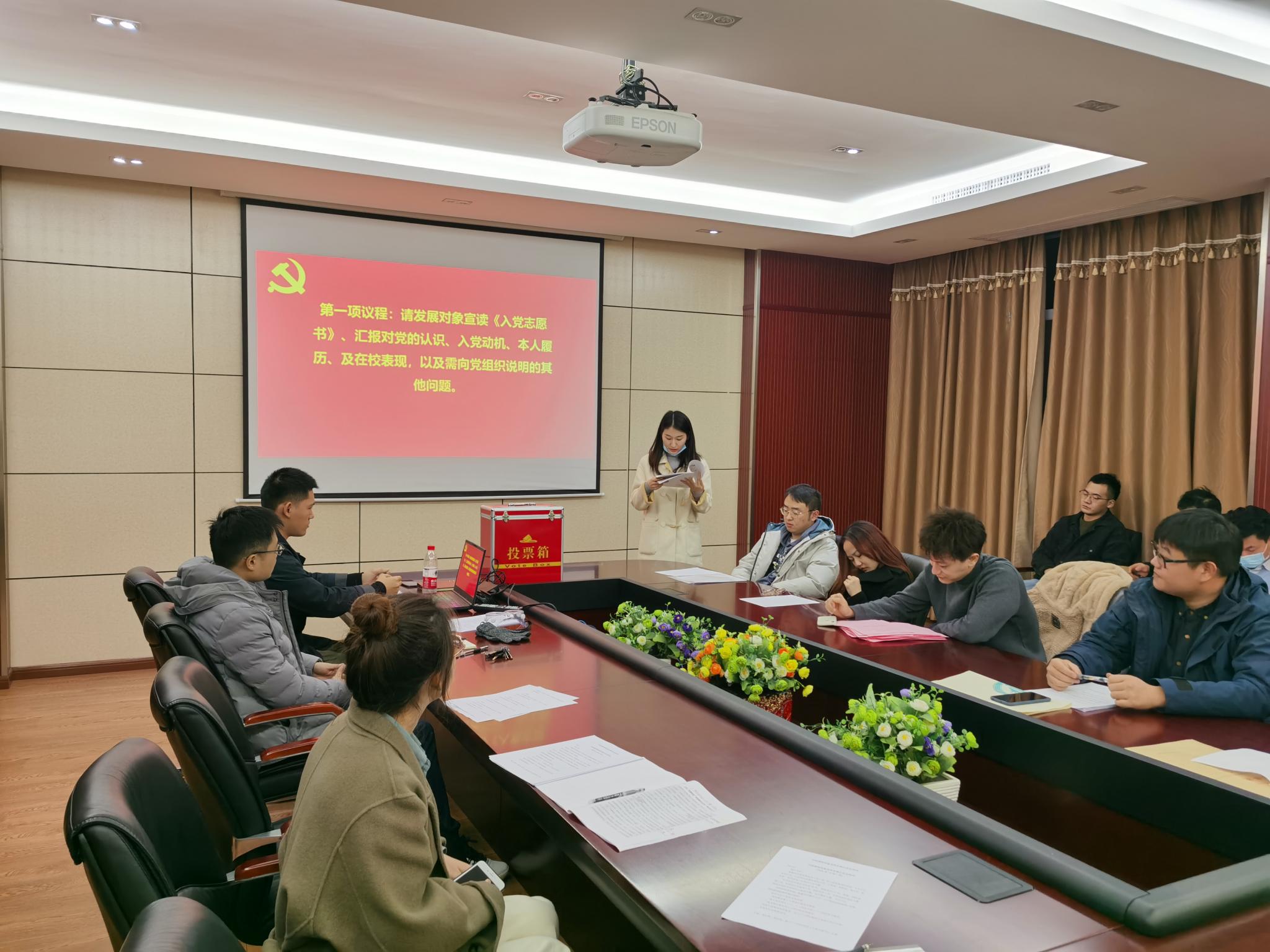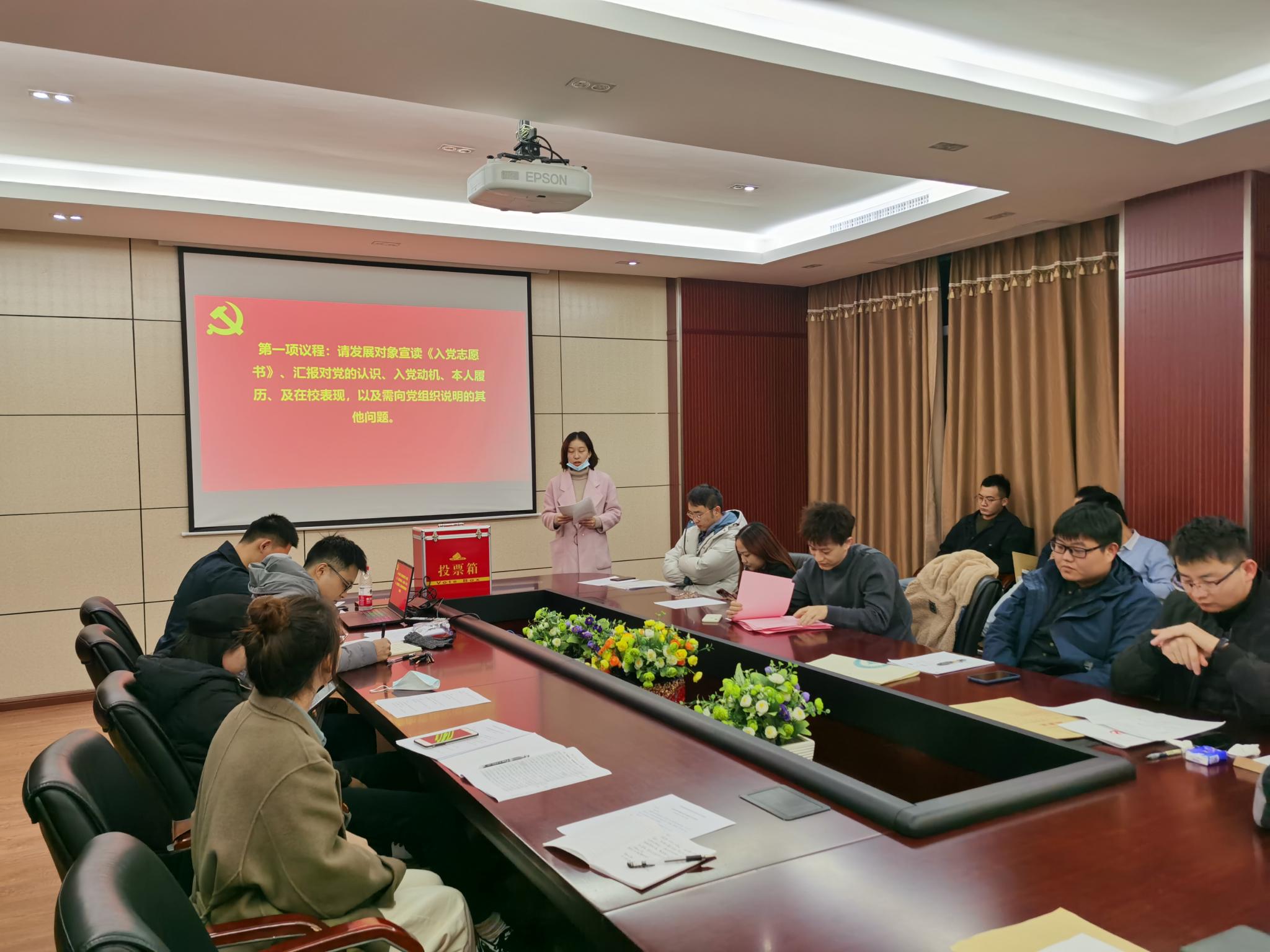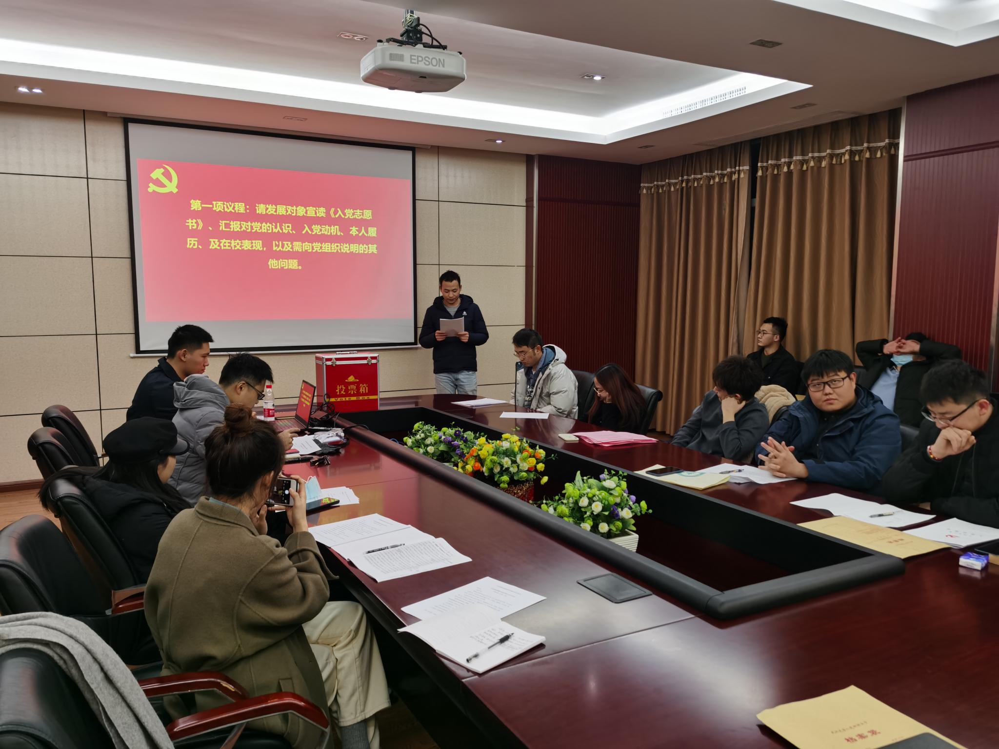 320会议室召开了讨论接收预备党员的支部大会,该会由本支部组织委员石昊同志组织,讨论表决发展对象赵立坤、王智成、杨静波、姜宇奇、唐诗琴、胡天怡六名同志的入党问题。本次会议由本支部党员以及发展对象一同参加,其中应到会正式党员28名,应到预备党员0名,实到会正式党员19名。