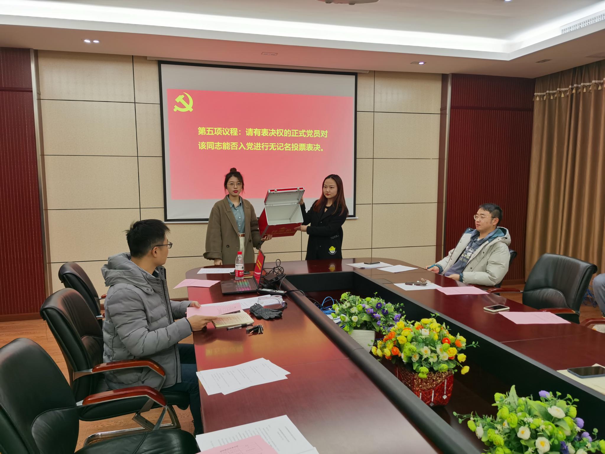 最后,主持人石昊同志宣布决议,同意接收赵立坤、王智成、杨静波、姜宇奇、唐诗琴和胡天怡六位同志为中共预备党员。赵立坤等同志分别进行了表态,阐述了自身存在的不足,明确了努力方向,力争做一名合格的共产党员。