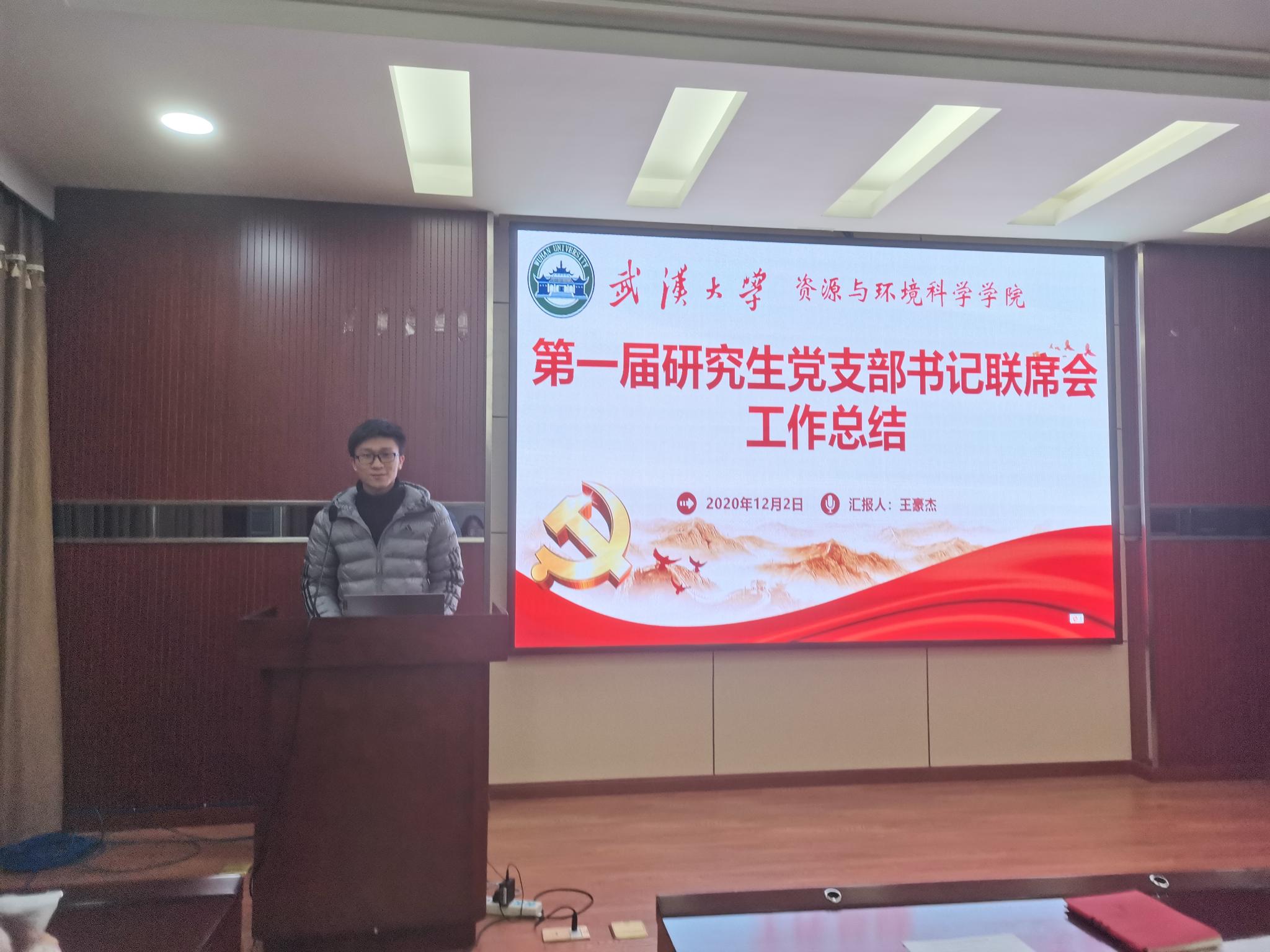 首先,由第一届联席会主席王豪杰同学做总结报告。他介绍了党支部联席会概况并汇报联席会成立一年来所做成果,包括党员的发展教育及管理监督、研究生党支部书记联席会和各党支部的组织建设、申报活力创新工程、组织实施先进党支部评选与民主评议党员工作、培养优秀党员骨干研究生、挖掘先进事迹等。进而展开对联席会的工作展望,建章立制,强化支部管理,对接好学校研究生党建的各项具体事务,在做好常规党务工作的基础上,更好地协助全体党支书共建有活力、有风采的支部;在学院党委的领导下,加强全院党员的思想教育工作,积极组织院研究生党员的理论和实践学习,夯实学习基础、创新学习形式、深化学习内容,树立先进典型,发挥模范作用;建立QQ群、微信公众号等交流展示平台,促进多媒体多渠道融合,凝聚学院研究生党支部;组织好支部使用经费开展活动,在吸收支部特色活动成功经验的基础上不断改进,扩大活动参与面与影响力,就目前正在进行的活力创新工程项目,协助好各支部书记推进活动开展。让活动不仅影响到参与者,也影响全体党员,进一步将活动吸引力扩大到全院乃至全校的同学,做品牌项目。切实让支部党员达到心灵上震撼、精神上洗礼、思想上升华,真正做到“一个支部一面旗,一名党员一盏灯”。