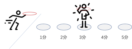 地面划定代表1-5分的圆圈(仅供一人站立的大小)。一名队员选择一个圈站立,另一队员站立在起投线外,将手中套圈扔到圈内队员的脖子上(圈内的人可以动,但不能出分数圈,且只能用脖子接圈)。套中之后,其他队员可以在对应分数的题目盒子里抓取题目进行作答,答对积对应分,答错不扣分,可以选择继续答题直至答对本题(仅限三分以上题目),或重新套圈抽题。记录积满6分的时长作为本关游戏时长。