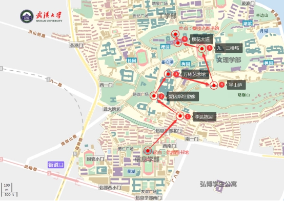 2.活动路线:信部图书馆(起点)——李达故居(第1站)——珞珈广场爱因斯坦像(第2站)——万林艺术博物馆(第3站)——半山庐(第4站)——九一二操场(第5站)——樱花大道(第6站)——樱顶老图(终点)