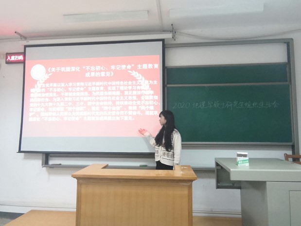 2020年11月6日,资环学院2020级地理学硕士研究生党支部于教1-204开展了以“巩固深化成果,践行初心使命”为主题的党日活动,组织支部12位党员同志学习《关于巩固深化“不忘初心、牢记使命”主题教育成果的意见》并进行交流探讨。