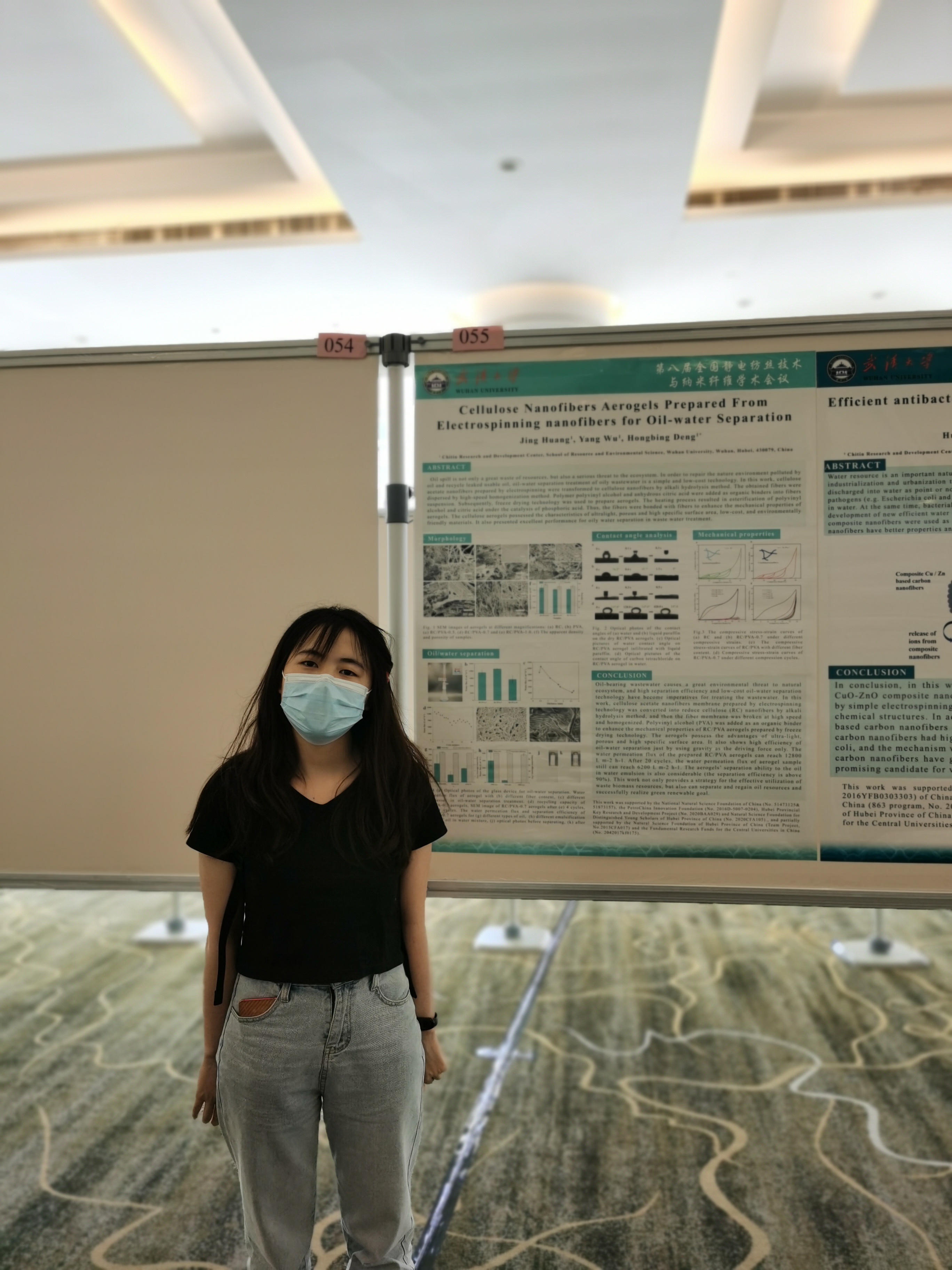 会议上,党支部成员苏会钰和黄京分别进行了题目为“Efficient antibacterial properties of electrospun CuO ZnO composite nanofibers ”和“Cellulose Nanofibers Aerogels Prepared From Electrospinning nanofibers for Oil-water Separation”的墙报展示。支部成员们积极参加观看会议中各会场的报告分享,学习自己所研究方向的新研究,新动态。党建促科研,支部成员参加学术会议的经历让大家积极了解了学术前沿动态,为进一步努力提高自身科学文化知识、科研水平起到了积极作用;为将来推动静电纺丝科技事业创新发展,助力建设世界科技强国播下了萌芽的种子。