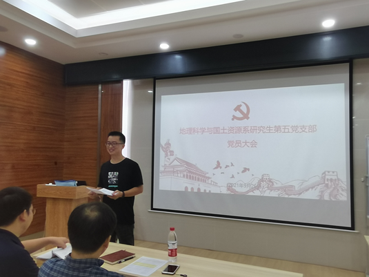 地理科学与国土资源系研究生第五党支部组建后第一次支部大会在电脑城429会议室举行。会议由支部代理书记程鹏同志主持,院党委副书记雷起宏书记,研究生辅导员李韩老师出席本次会议。