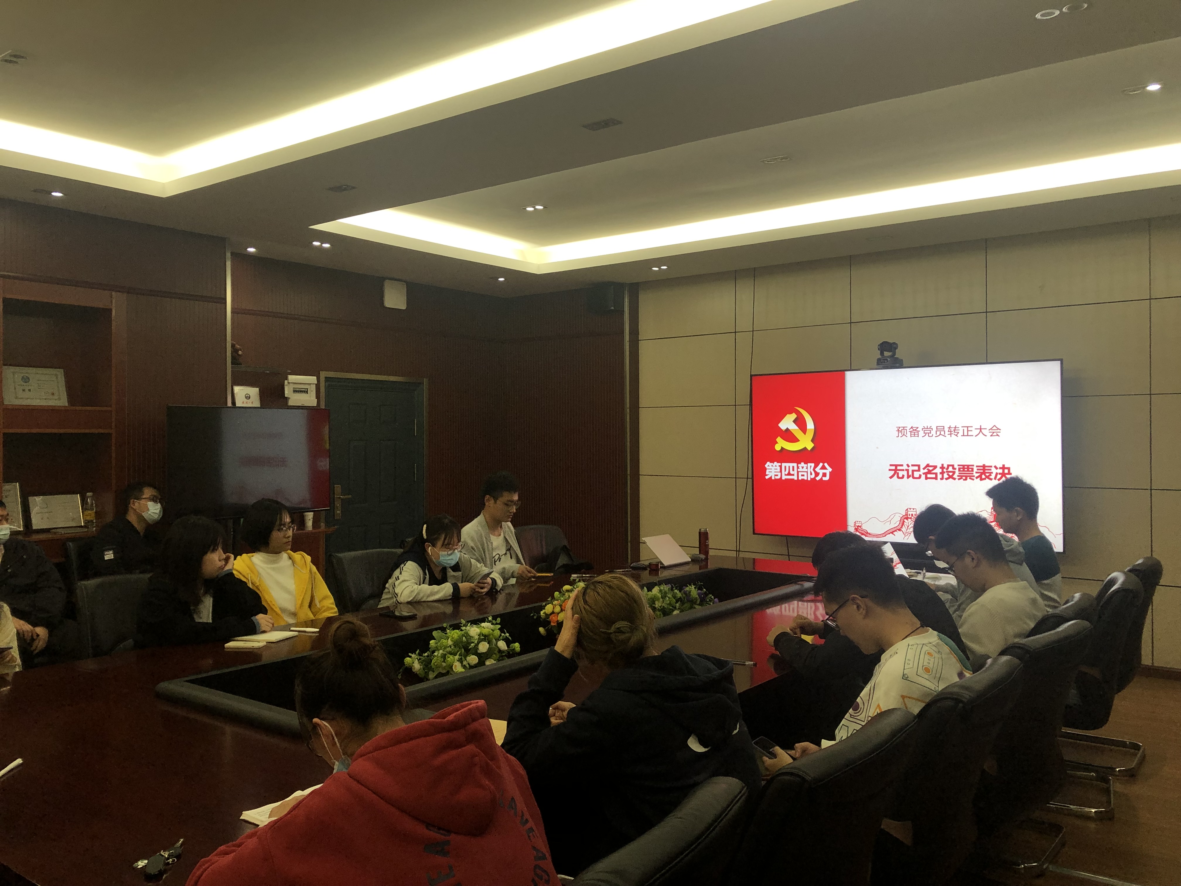 会议第二项:讨论并表决关于王宇航、刘辰辰和王诗宇共3位预备党员转为正式党员的申请。首先由3位预备党员提出转正申请,并主动汇报思想、学习和生活等方面的情况。培养联系人和与会党员分别对3位预备党员各方面的情况发表意见,一致认为3位同志已具备正式党员的条件。经表决通过,本次会议由王子任和樊晓辉两位同志分别担任监票人和计票人,具有表决权的15位正式党员进行无记名投票,3位预备党员以赞成票:15票,反对票:0票,弃权票:0票的投票结果正式被接收为正式党员。最后,支部书记樊晓辉带领三位转正党员进行入党宣誓,并对王宇航、刘辰辰和王诗宇共3位正式党员表达出期望,希望转正以后能够积极参与活动。