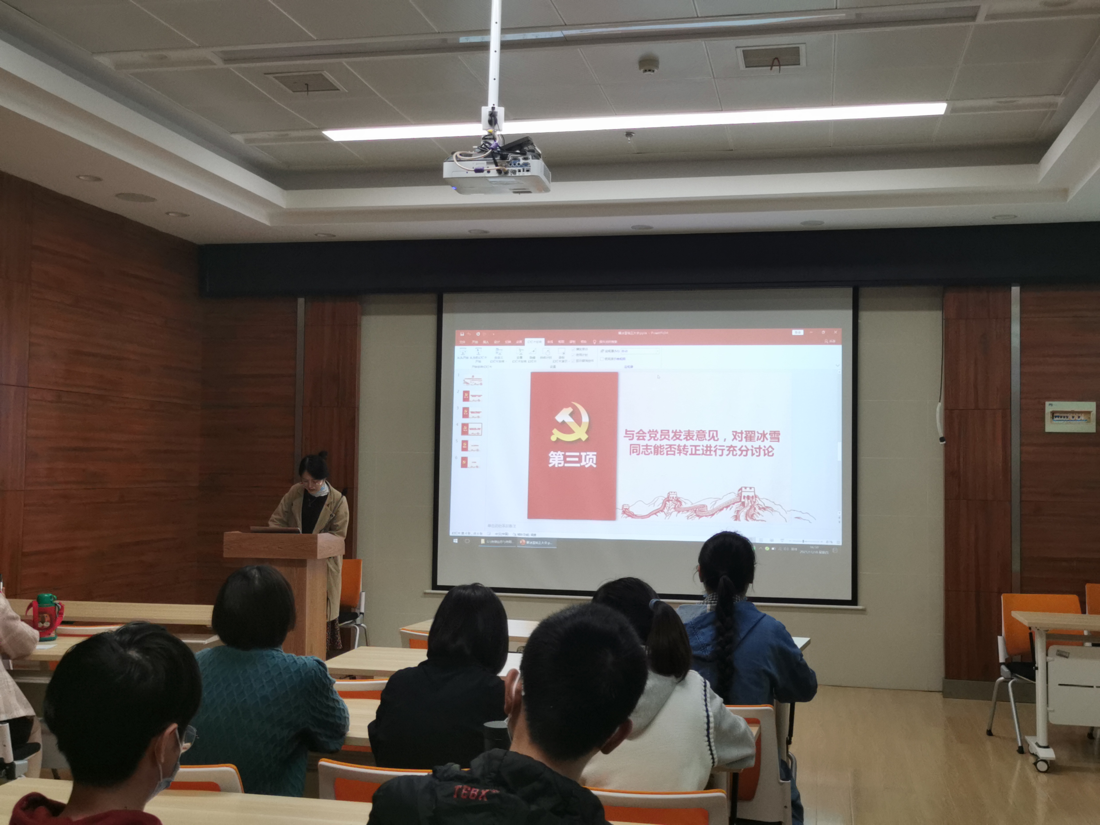 会议第一项,讨论翟冰雪同志的转正工作。首先由预备党员翟冰雪同志汇报预备期间的思想和工作情况;之后由党支部书记张梦同志代表支部委员会报告翟冰雪同志预备期间的教育考察情况;接着,与会党员发表意见,对翟冰雪同志能否转正进行充分讨论。经过由表决权的正式党员进行无记名投票,本次大会表决结果为:翟冰雪同志得赞成票14张,不赞成票0张,弃权票0张。张梦同志宣布翟冰雪同志全票通过,同意其按期转正为中共正式党员。最后,党员翟冰雪同志进行表态,向党组织表明了自己的决心和信心。