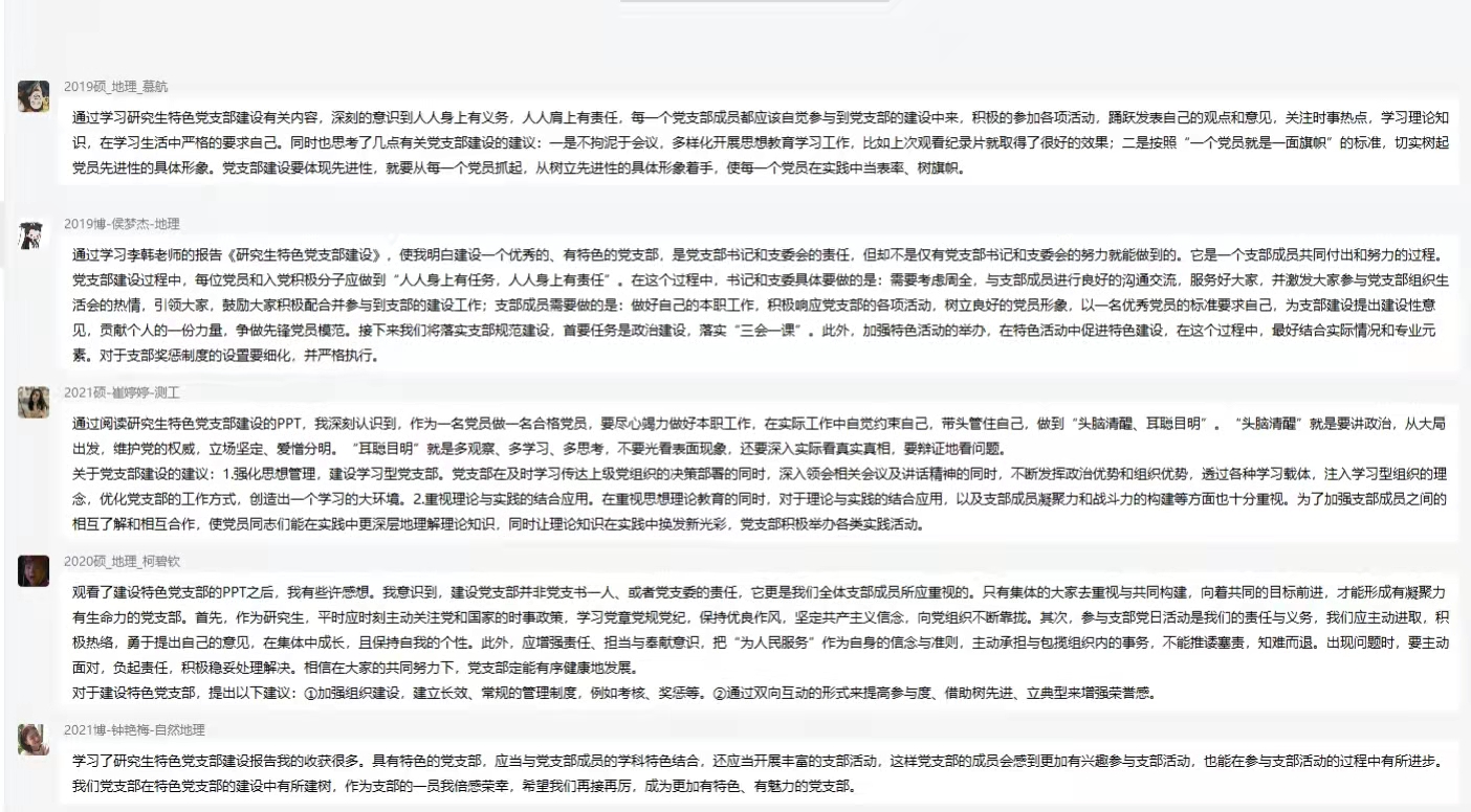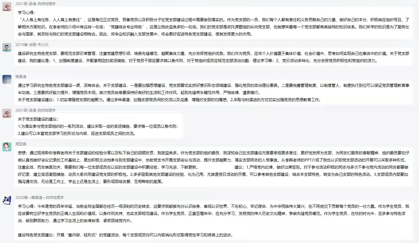吴倩同志认为,党建要结合专业特色,地理科学与国土资源系第四党支部是依托课题组的纵向党支部,也就意味着每一个党支部都有其独特的知识体系。我们所学的知识是为了服务社会与国家,其目标与我们的党支部建设相吻合。因此,将专业知识融入支部发展中,将会更好促进特色党支部建设、使其发挥更大的作用。