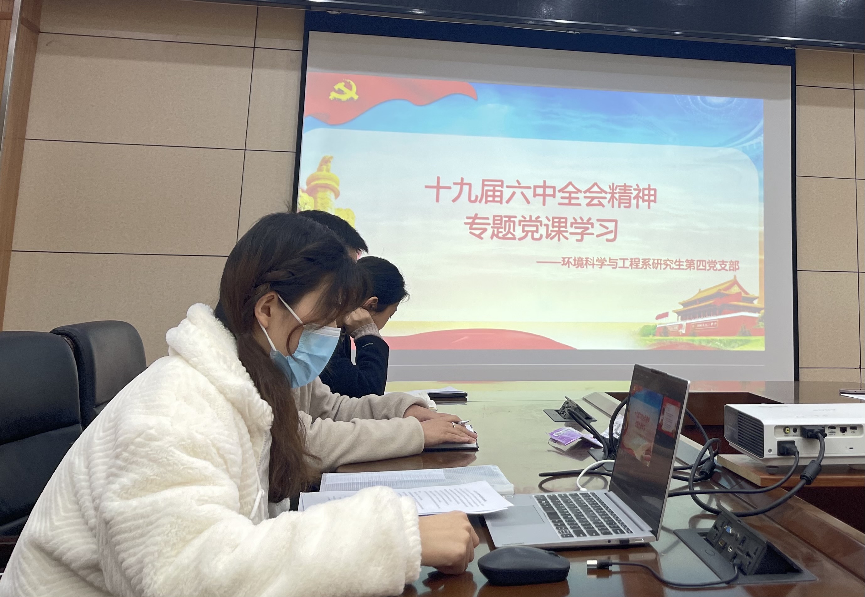 2021年11月24日下午,环境科学与工程系研究生第四党支部在工学部新9教212会议室开展了11月份主题党日活动,举行党的十九届六中全会精神学习宣讲暨预备党员转正大会。21位党员以及9位积极分子和发展对象参加了会议,会议由纪检委员陶卉婷主持,会议分为两个阶段进行。