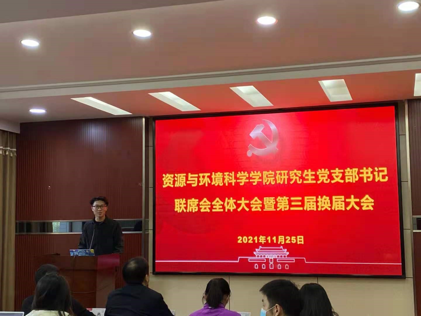 研究生党支部书记联席会全体大会暨第三届换届大会在学院220报告厅隆重召开。院党委副书记雷起宏老师、院研究生辅导员马丽华老师、梅菲老师、李韩老师,院研究生会主席团成员钱婧同学和院研究生党支部书记联席会全体成员参会。