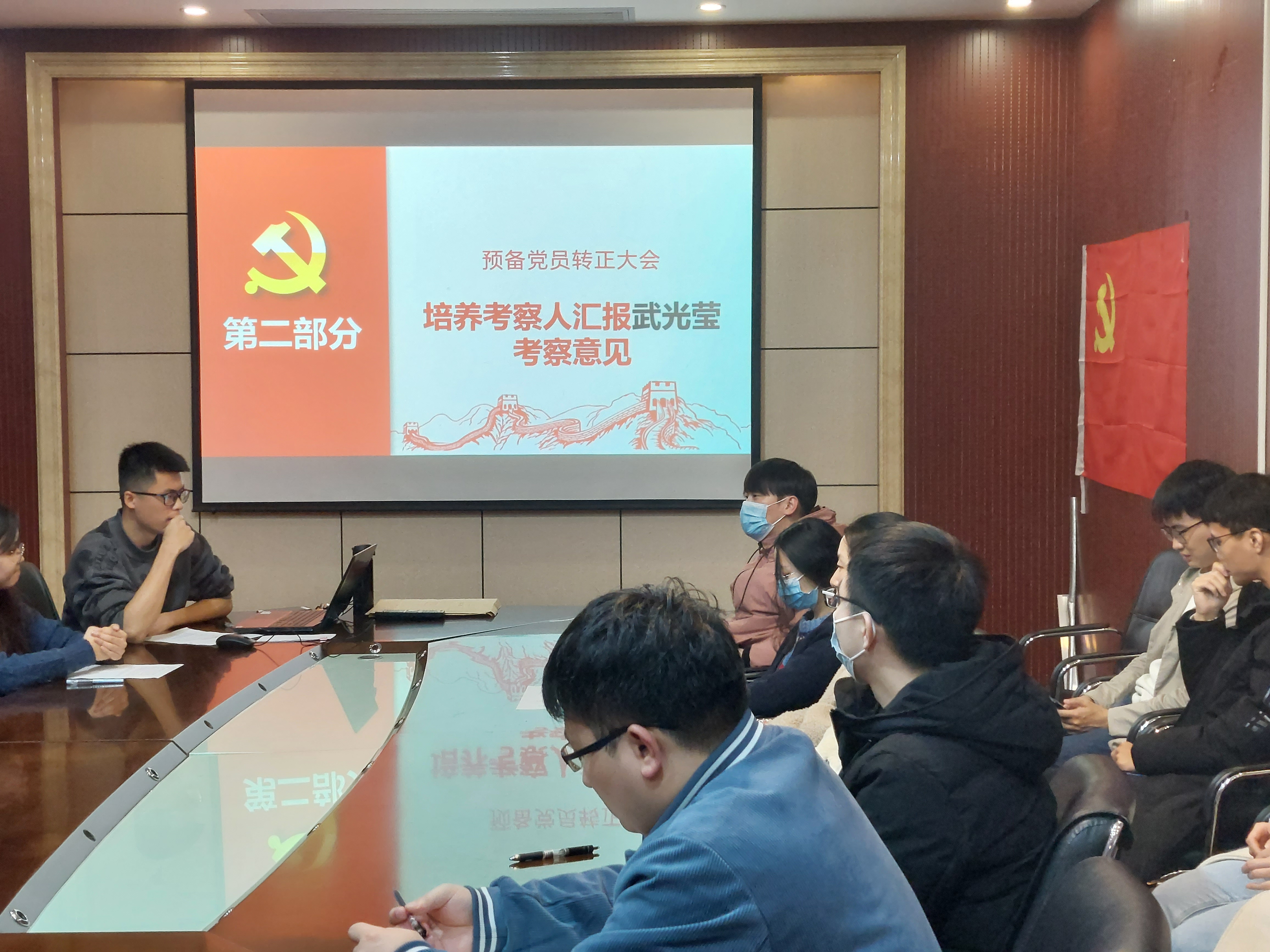 504会议室召开预备党员转正大会。本次会议由支部书记余华飞同志主持,主要内容包括武光莹同志与安佳燕同志的预备党员转正讨论。本次会议应到正式党员及预备党员18人,实到参会党员17人,发展对象与入党积极分子也参与了会议。