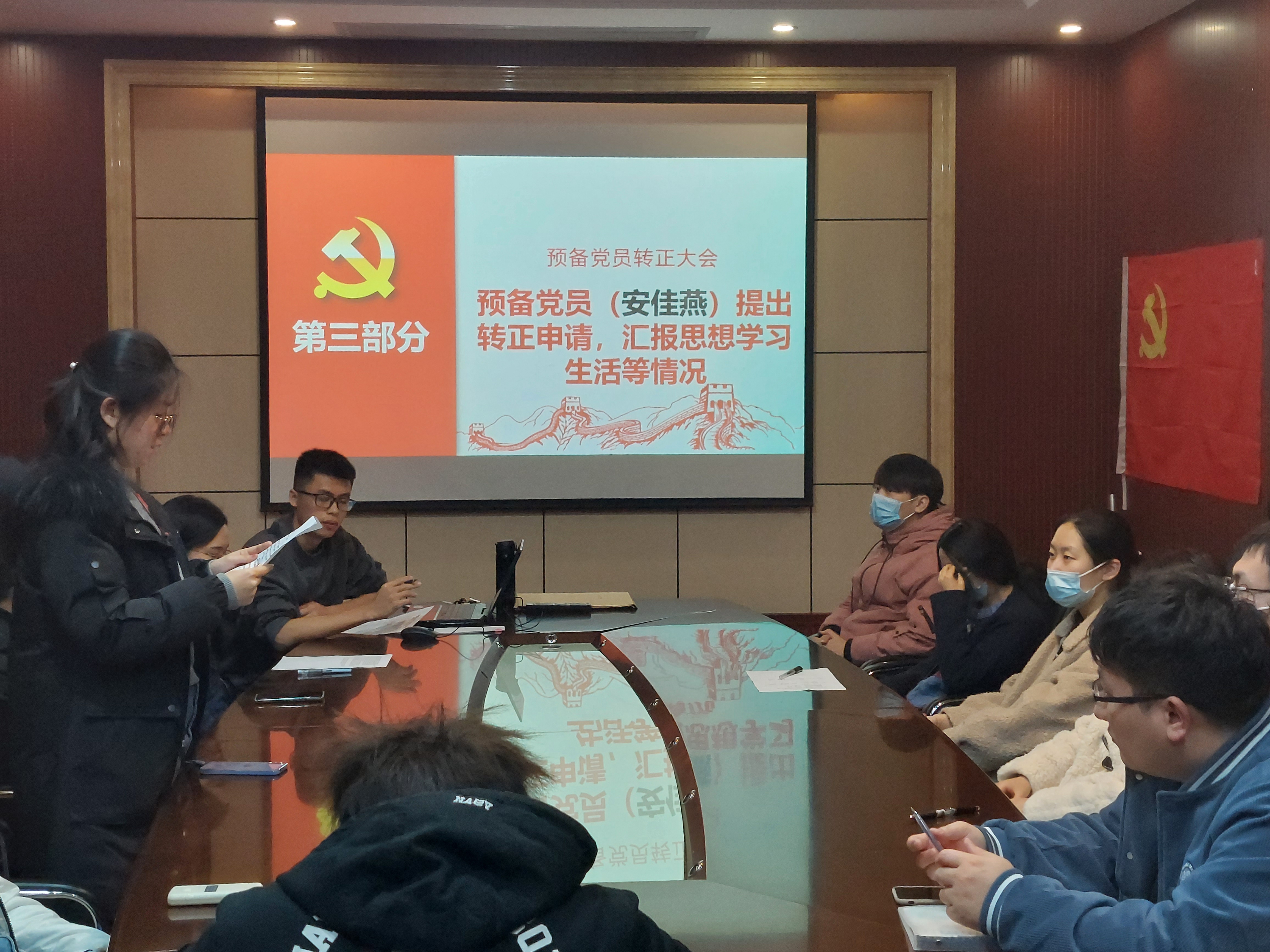 会议开始,由支部书记余华飞同志对本次会议的基本内容进行了介绍,主要为讨论武光莹同志与安佳燕同志的转正讨论。首先,武光莹同志和安佳燕同志向组织汇报了自己在预备期间的工作学习情况,阐述了个人思想认识等方面的进步,表达了自身的转正意愿。
