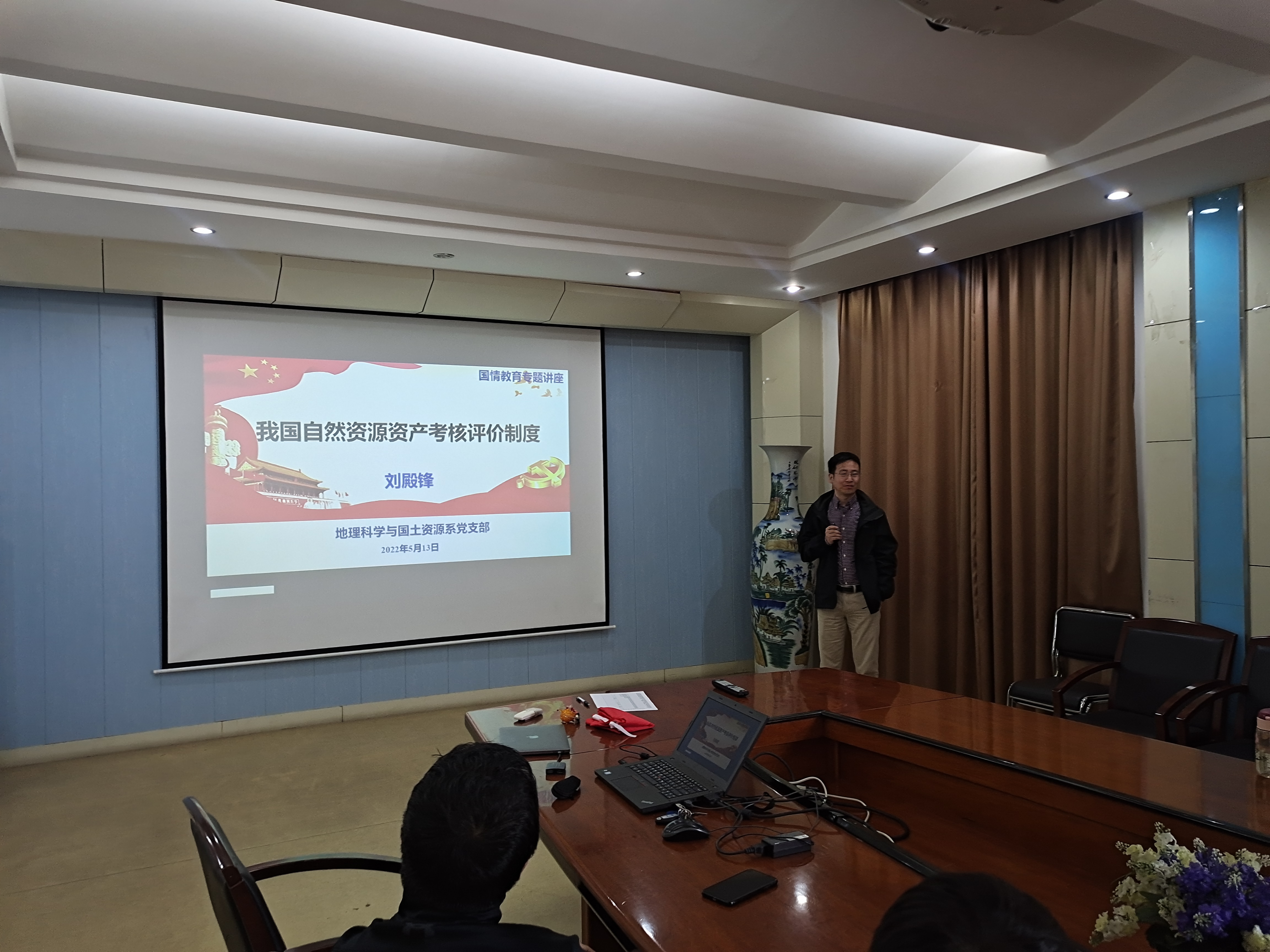 随后,刘殿锋老师以“我国自然资源资产考核评价制度”为党课主题,从自然资源的概念与体系切入,围绕着“自然资源资产产权制度改革”、“全民所有自然资源资产所有权委托代理行使机制”等方面介绍了我国当前自然资源产权管理的现状。同时结合相关考核制度案例,梳理自然资源资产考核评价实施主体、评价内容、评价方式、评价实施与评价结果等各环节的特征与问题。同时,刘老师结合自然资源资产管理的目的,讨论了自然资源资产考核指标体系的构建原则与思路。