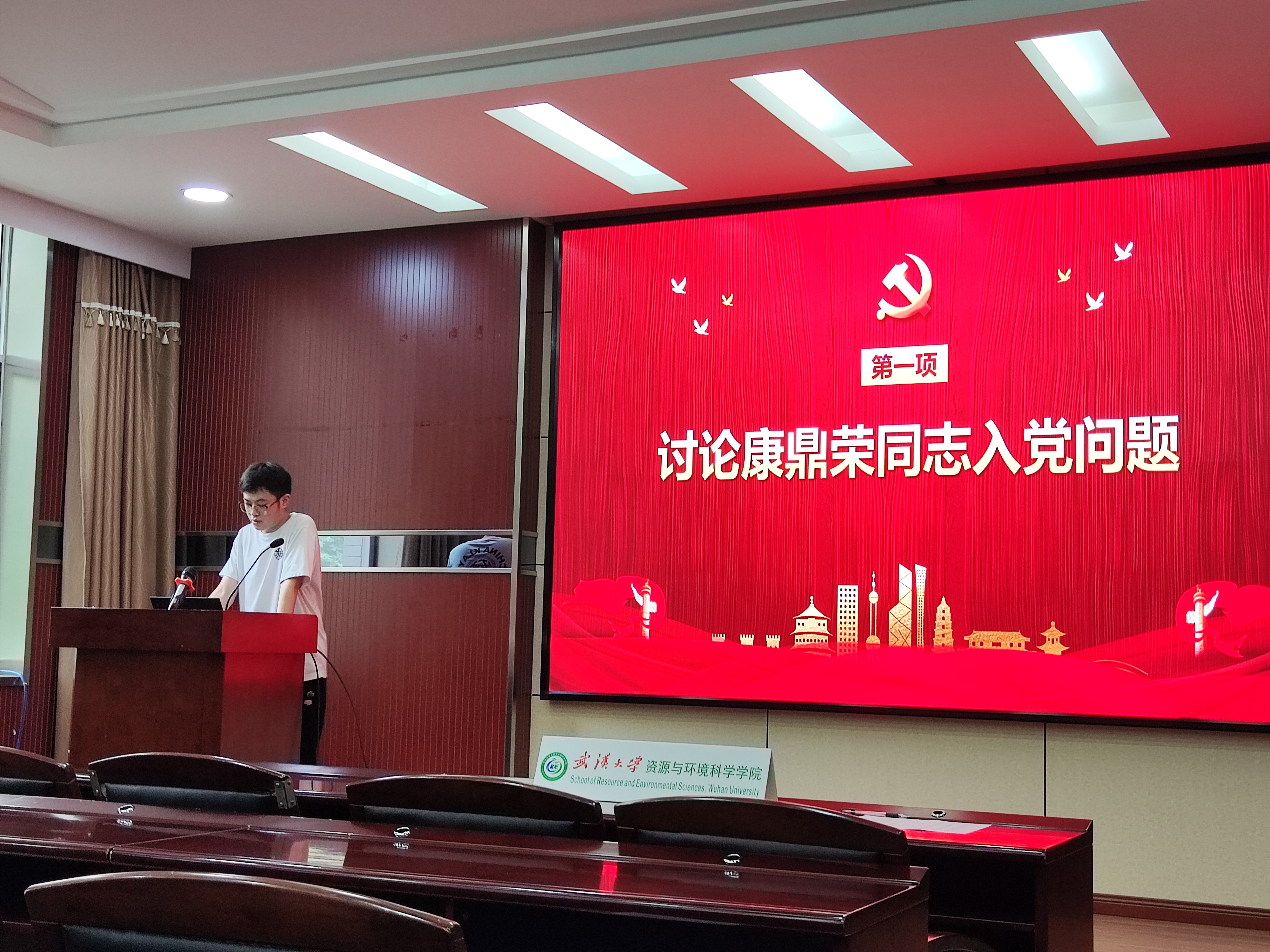 会议第一项,地理科学与国土资源系研究生第一党支部开展讨论接收康鼎荣同志为预备党员的支部大会。发展对象康鼎荣同志从个人情况、党史学习、入党初心等方面展开汇报。入党介绍人陈慧婷、刘岁,支委会代表盛舒童对该同志的汇报及日常表现点评,一致认为该同志在积极向党组织靠拢但在实践中仍有改进的空间。与会党员张洪鑫、李莹分别从学习、生活及为人等方面给予客观评价,对是否接收该同志为预备党员展开充分讨论。最后,经监票人、计票人统计,庞惠心宣布无记名投票表决结果:赞成票24票,不赞成票0票,弃权票0票,赞成人数超过到会有表决权人数的半数,同意接收其为预备党员。康鼎荣同志随后上台发言,对支部的培养和与会成员的建议表示感恩,并表示此后将以更严格的态度和标准要求自己,勤学修德、明辨笃实,争做有为青年。
