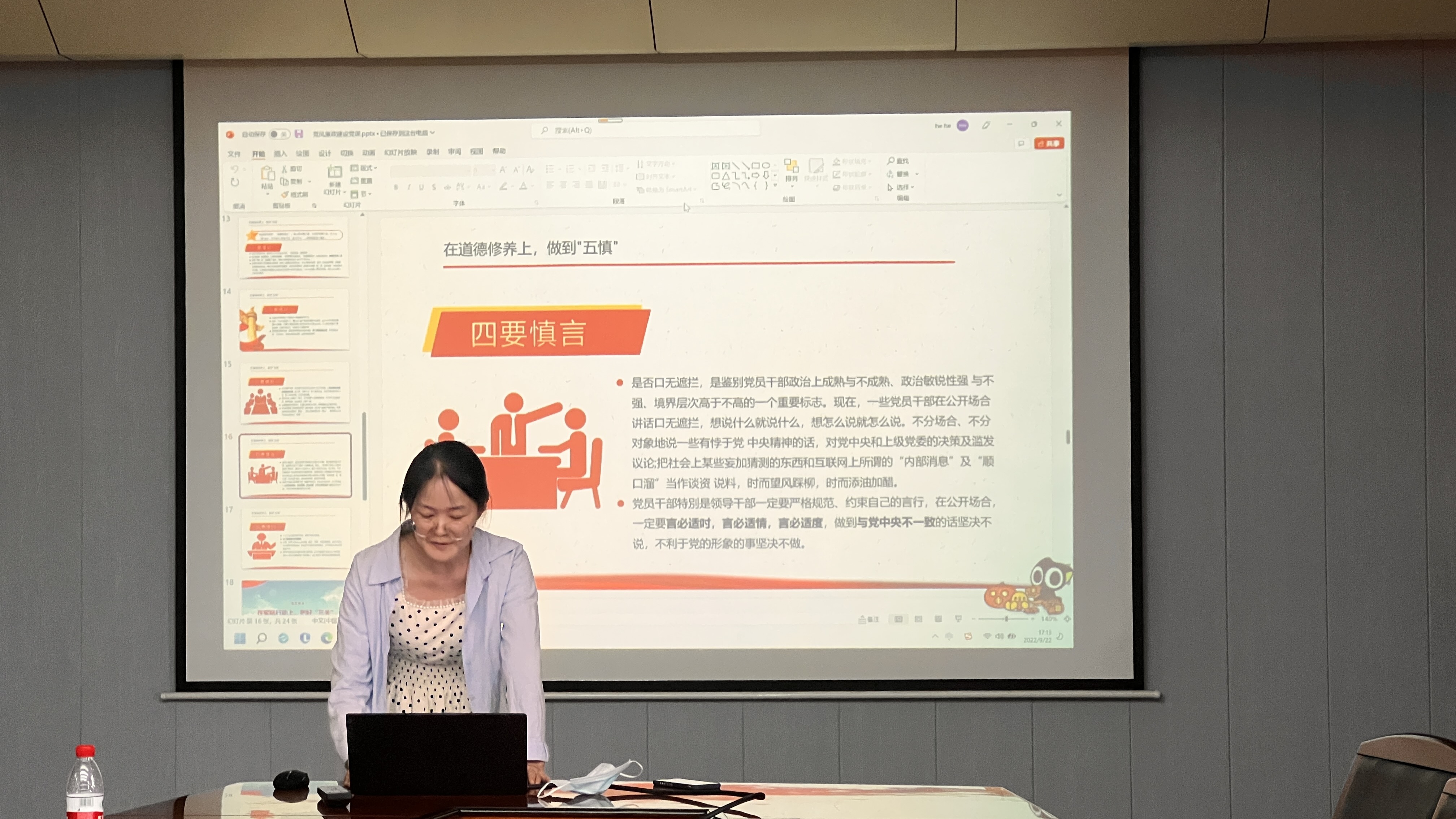 会议开始,支部成员独立完成并学习了2022年宣教月纪法知识测评卷。随后,张梦同志介绍了本次会议的流程,本次党日活动的主题为“党风廉政建设”,张梦同志从思想境界、道德修养和实际行动三个方面,向支部成员阐述了为什么要进行党风廉政建设,和党员应该怎样参与到党风廉政建设之中。张梦同志强调,党员同志们要在思想境界上强化四个意识,在道德修养上做到“五慎“,在实际行动上把好”三关“。