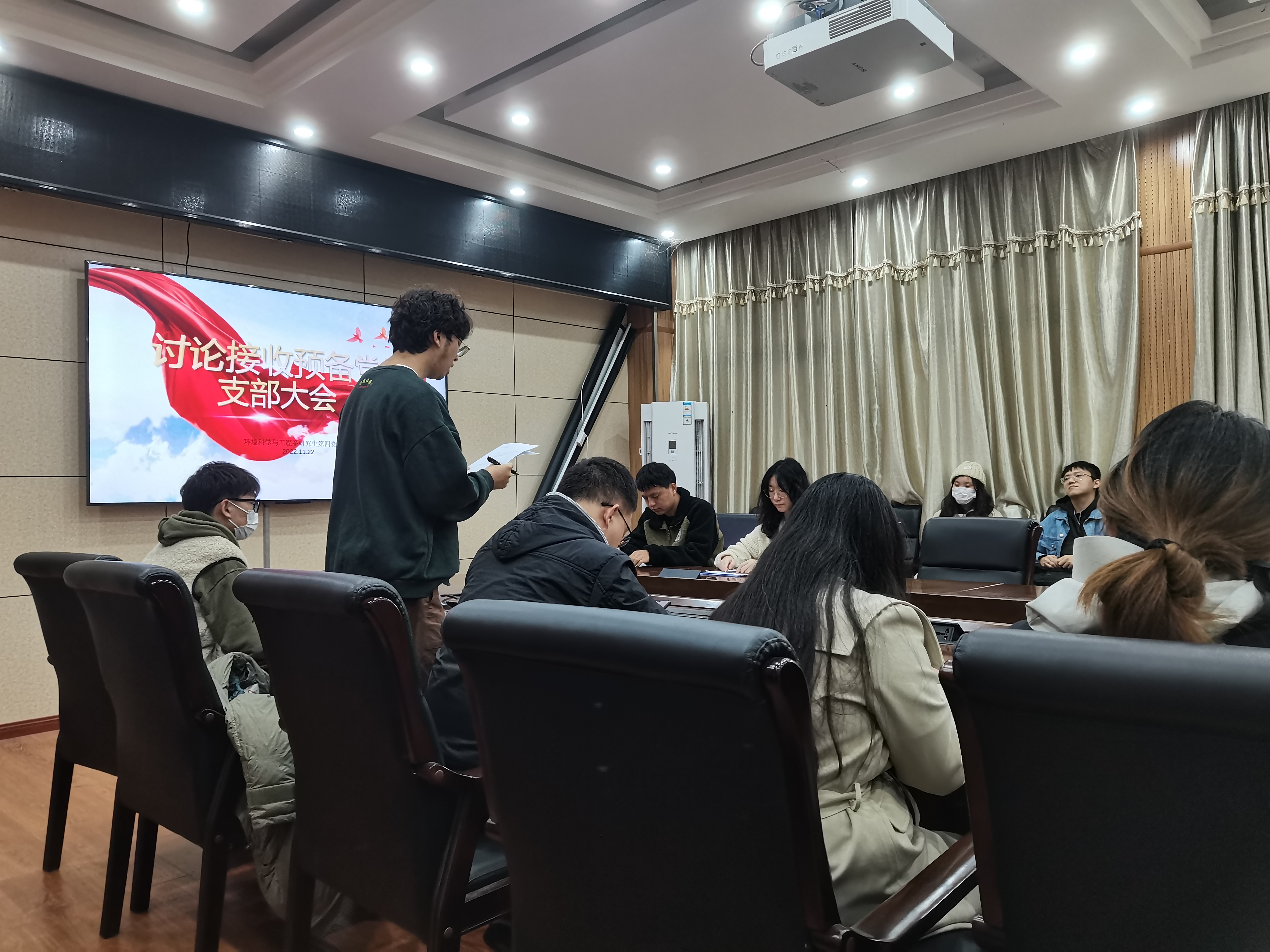 20221122日上午1030分,环境科学与工程系研究生第四党支部接收预备党员大会于工学部动机院院办212会议室召开。本次会议由支部书记蔡云高同志主持,主要内容为对童欣、王鹏程同志的预备党员接收谈论,会议应到正式党员21人,预备党员5人,实到正式党员16人,预备党员4人。