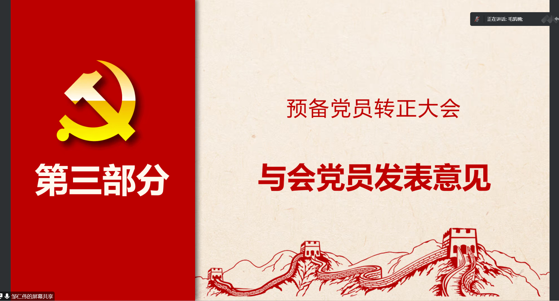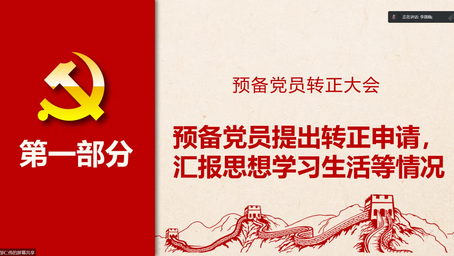 会议开始,由支部书记邹仁伟同志对本次会议的基本内容进行了介绍,主要为讨论任毅同志和李国稳同志的预备党员转正申请。首先,任毅同志与李国稳同志向组织汇报了自己在预备期间的工作学习情况,阐述了个人思想认识等方面的进步,表达了自身的转正意愿。
