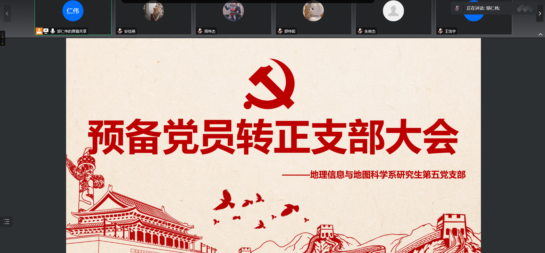 2022年12月23日地理信息与地图科学系研究生第五党支部于线上腾讯会议召开预备党员转正大会。本次会议由支部书记邹仁伟同志主持,主要内容为任毅同志和李国稳同志的预备党员转正讨论。本次会议应到正式党员及预备党员30人,实到参会党员22人,发展对象与入党积极分子也参与了会议。