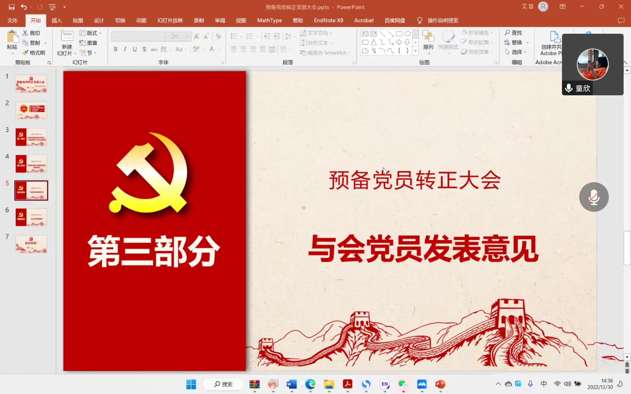 20221230日下午23分,环境科学与工程系研究生第四党支部召开预备党员转正大会。由于疫情影响,本次会议于线上召开,由艾慧同志主持,主要内容为讨论预备党员杨帆同志的转正问题。本次会议应到正式党员21人,预备党员7人,实到正式党员13人,预备党员7人,请假8人,有表决权的到会人数超过应到会有表决权人数的半数,符合规定人数,可以开会。