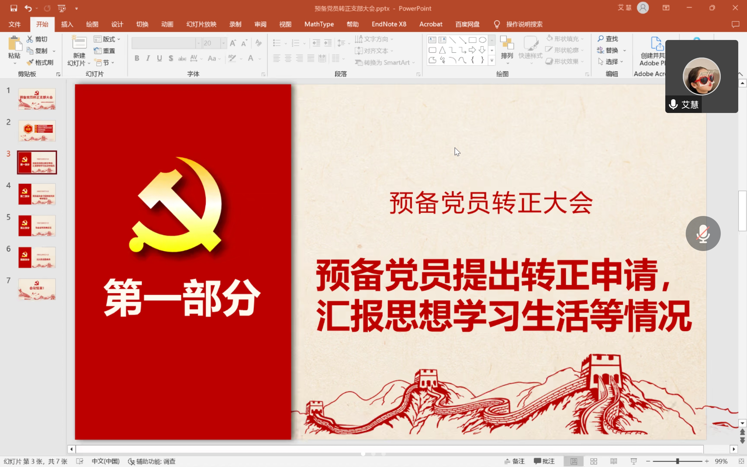会议第一项:由预备党员杨帆同志汇报预备期间的思想和工作情况。