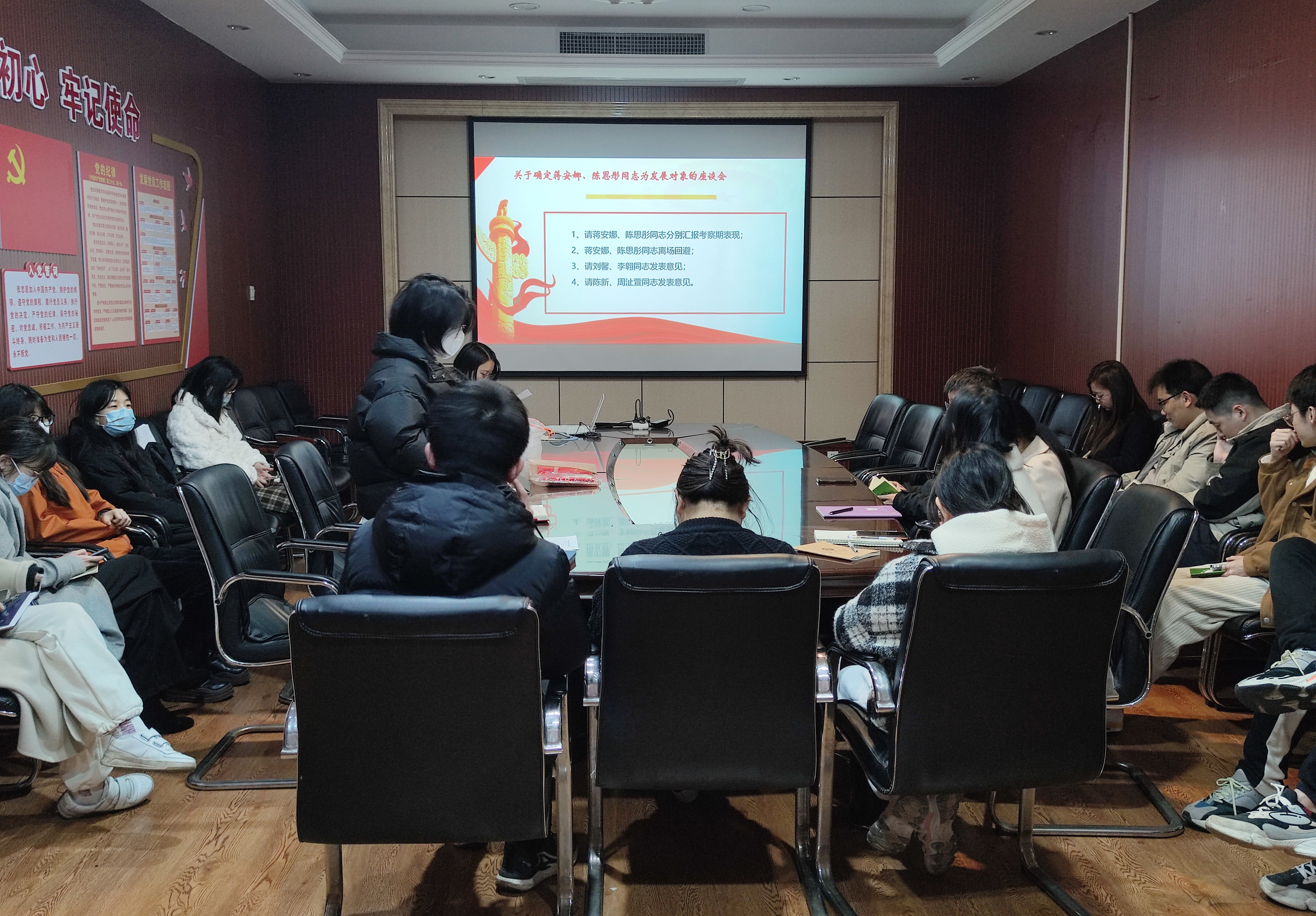 会议第三项,听取党员和群众对于确定蒋安娜、陈思彤同志为发展对象的意见。蒋安娜、陈思彤同志汇报个人情况后回避离场,支部同志们展开广泛交流。刘馨和李翱同志对蒋安娜同志的现实表现予以肯定,同时建议其平衡好科研与生活的关系。陈新和周沚萱同志赞扬了陈思彤同志在过去一年的显著进步,也希望其提高自身情绪管理能力。经支部充分讨论,一致认为蒋安娜和陈思彤同志表现优异,达到了发展对象的条件与要求。