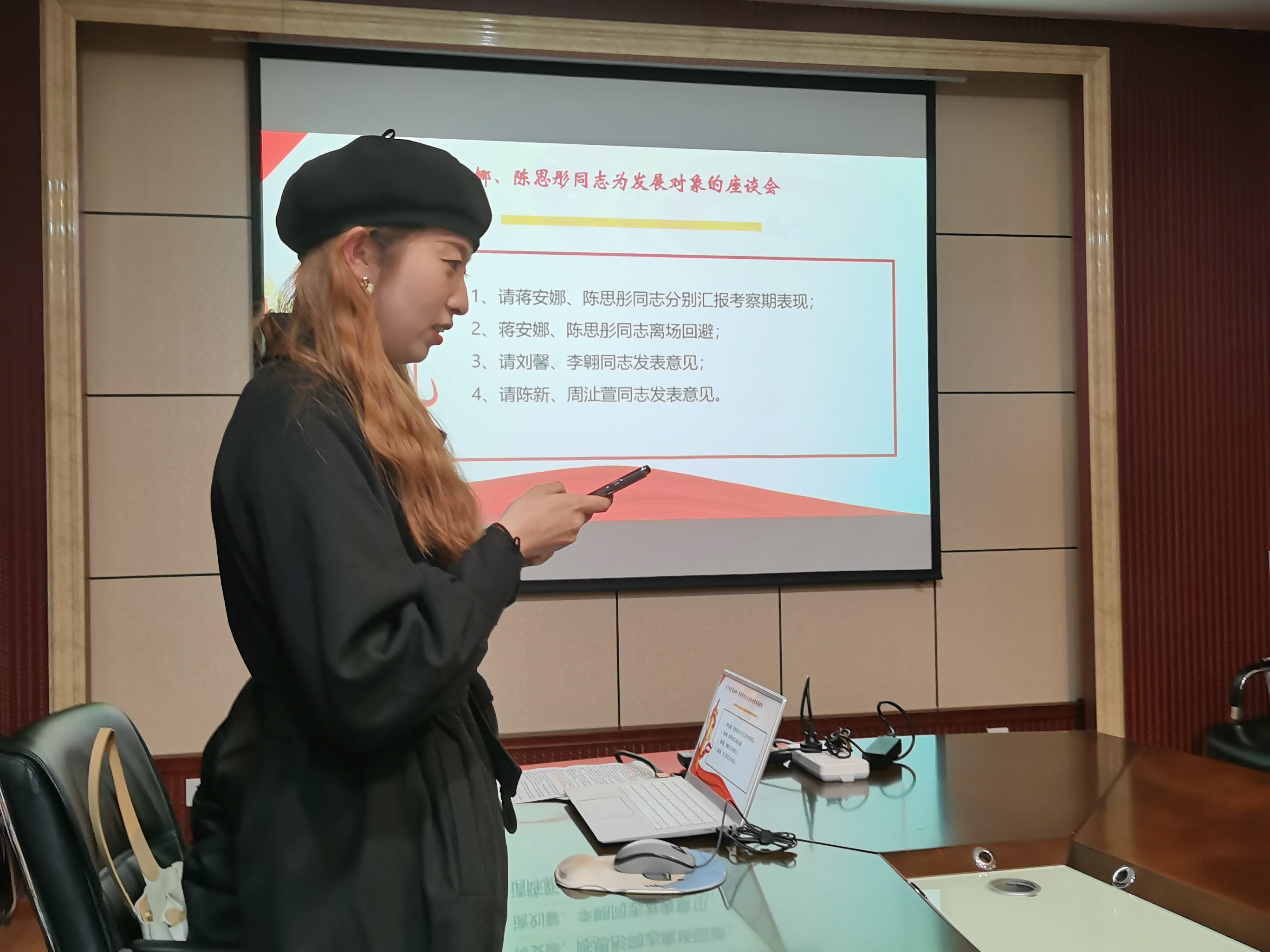 办公楼504会议室召开“关注时事热点 争做时代青年”主题党日活动暨关于确定蒋安娜、陈思彤同志为发展对象的座谈会,会议由党支部书记何凡同志主持。