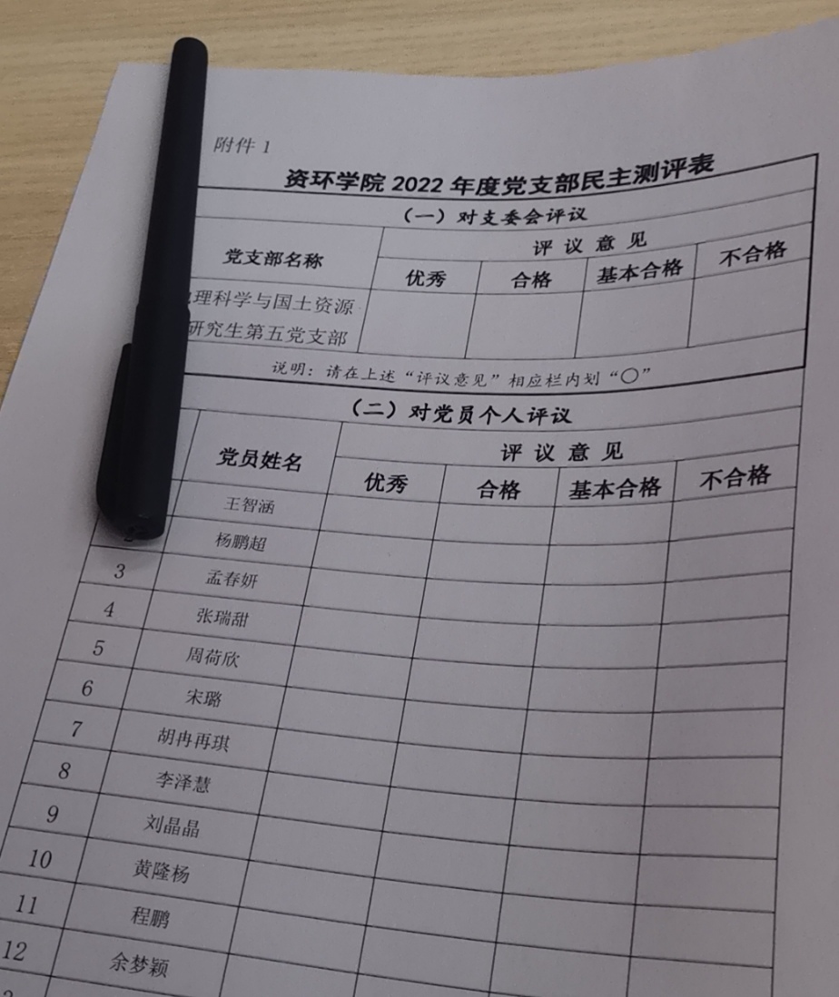会议第四项,开展2022年度党支部民主测评。根据学院党委的相关要求,促进支部积极开展党员批评自我批评,我们开展2022年度党员民主测评,每位党员同志都要对自己以及其他党员进行综合考量和等级评定,其中评定为“优秀”的比例一般不超过党员总数的1/3,即不超过8名。该评议结果将作为评先评优、推荐遴选等方面的重要参考。