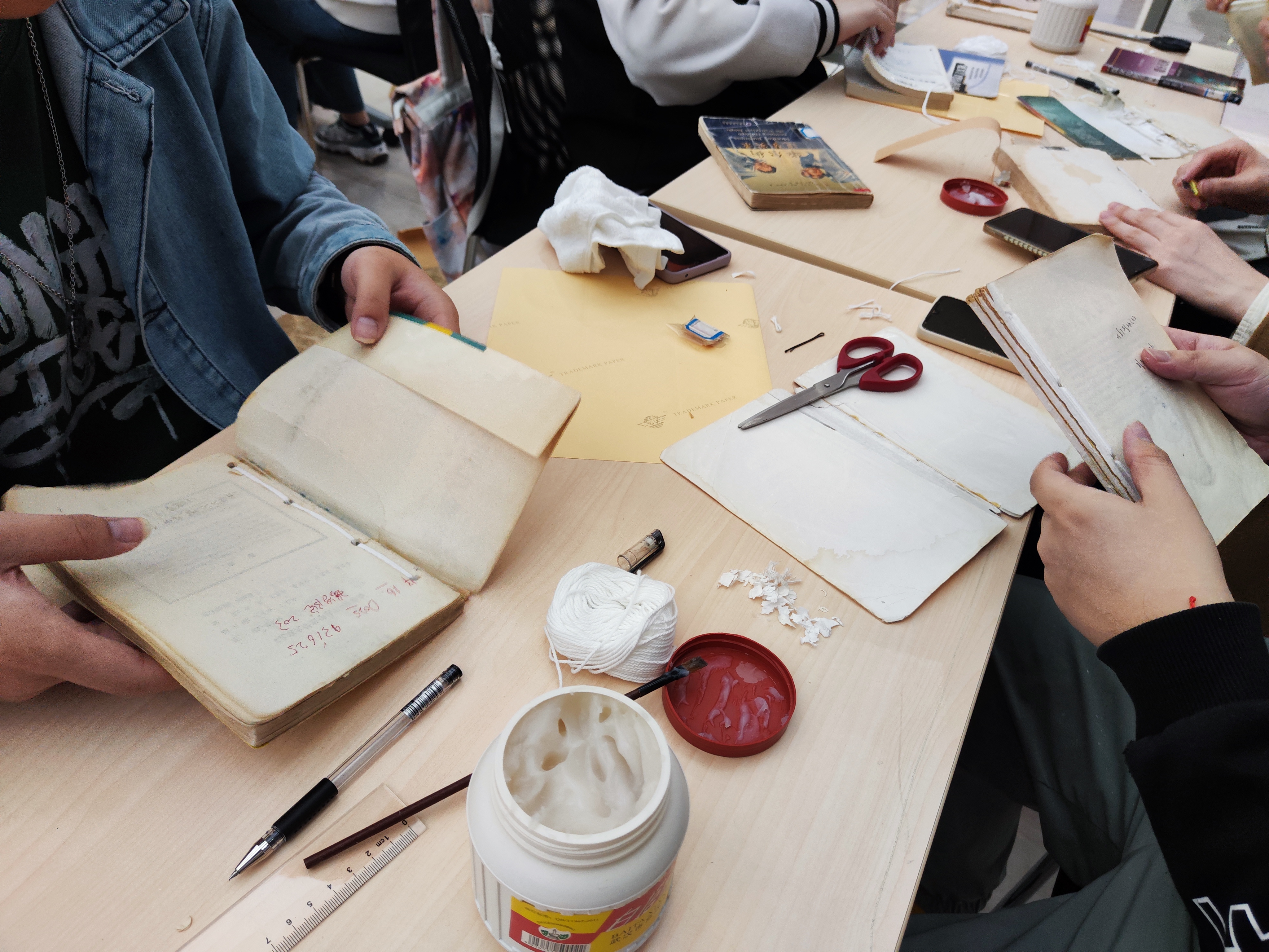 在修书志愿队的同学演示完毕后,支部成员便正式开始修复自己手中的第一本书。从截取装订线,到裁剪接补纸,到最后粘合脱落的书皮,支部成员们聚精会神,热火朝天地工作着。经过一上午支部成员们联合修书志愿队同学们的修补,40余本破损的书籍换上了新装,焕发了新的生机与活力。一本本图书仿佛艺术品一般摞列在一起,散发着思想的魅力。修书如修心,在修复古籍的过程中,我们每个人的心都静了下来,暂时忘却了生活中的烦恼与琐事,全神贯注于艺术品的创作之中。