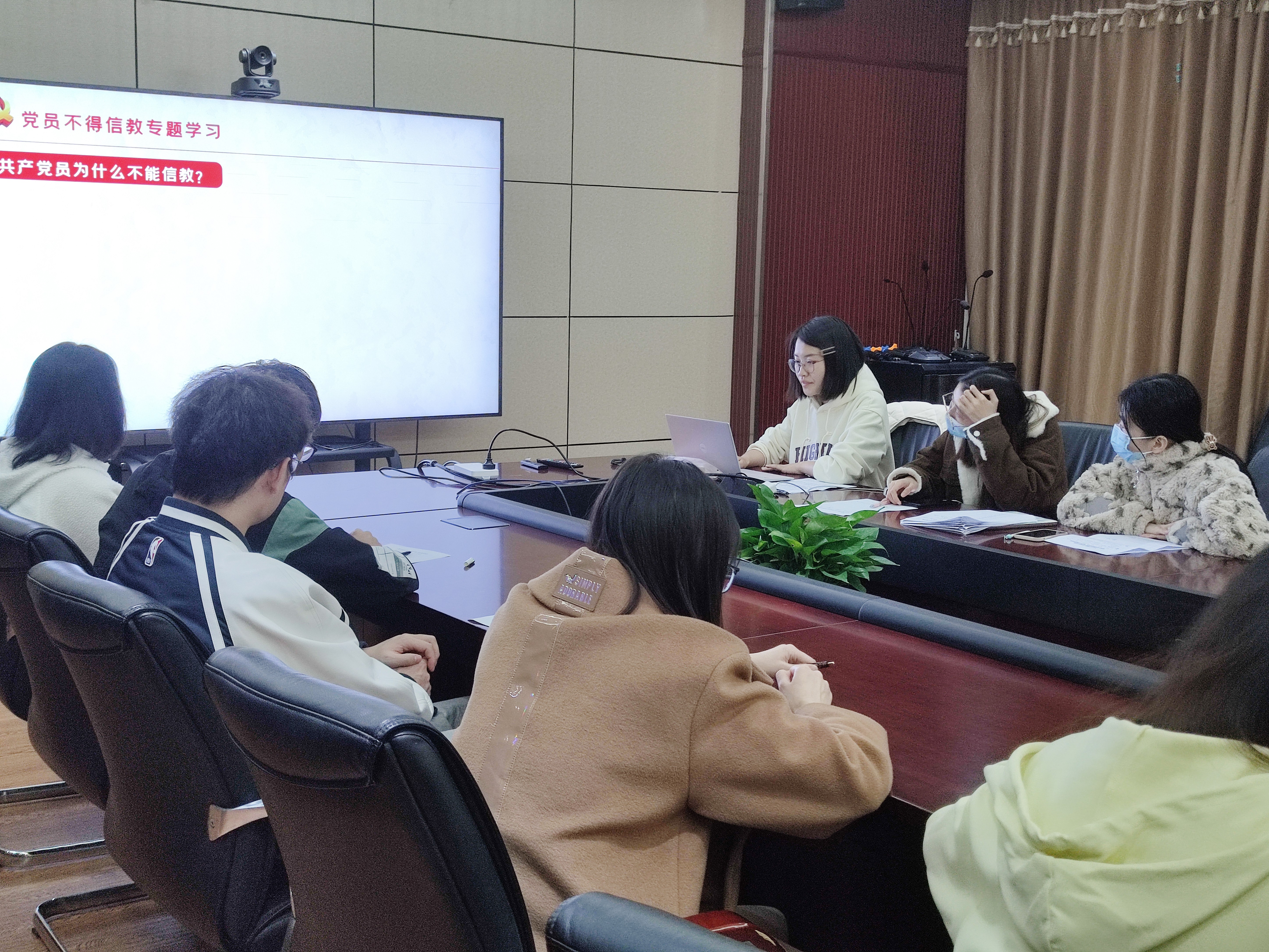 2023年3月16日19:30,环境科学与工程系研究生第二党支部在资环院办320开展组织生活会和民主评议党员工作,同时进行党员不能信教专题学习。本次会议由党支部书记何凡同志主持,支部党员、发展对象、积极分子参加会议。