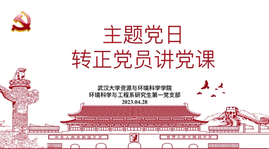 2023年4月28日上午10:00,环境科学与工程系研究生第一党支部于线上腾讯会议开展了“转正党员讲党课”主题党日活动,本次大会由支部书记胡慧同志主持,由支部近期转正党员李晓忠同志和陈欣怡同志为大家讲党课。