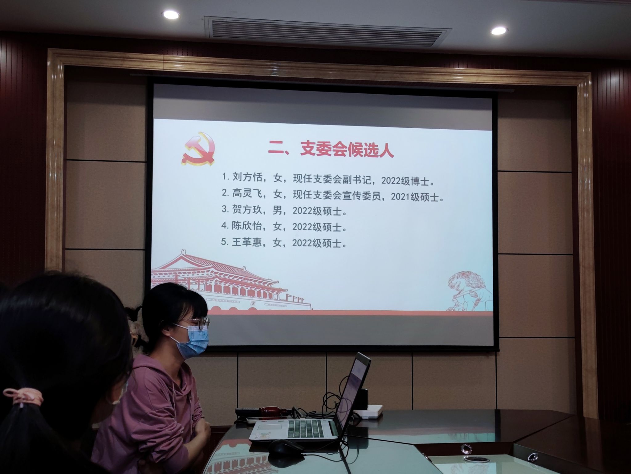 最后,党支部新一届支部委员进行了第一次会议,选举出高灵飞同志担任党支部书记,贺方玖同志为党支部副书记,王革惠同志为组织委员,陈欣怡同志为宣传委员,刘方恬同志为纪检委员。