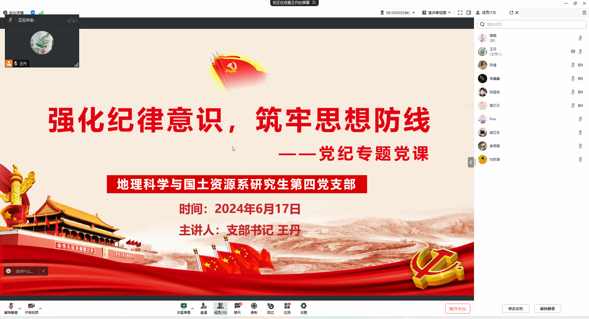 2024年6月17日16:00,地理科学与国土资源系研究生第四党支部在线上组织学习了“强化纪律意识,筑牢思想防线”党纪专题党课。本次专题党课由支部书记王丹主讲。