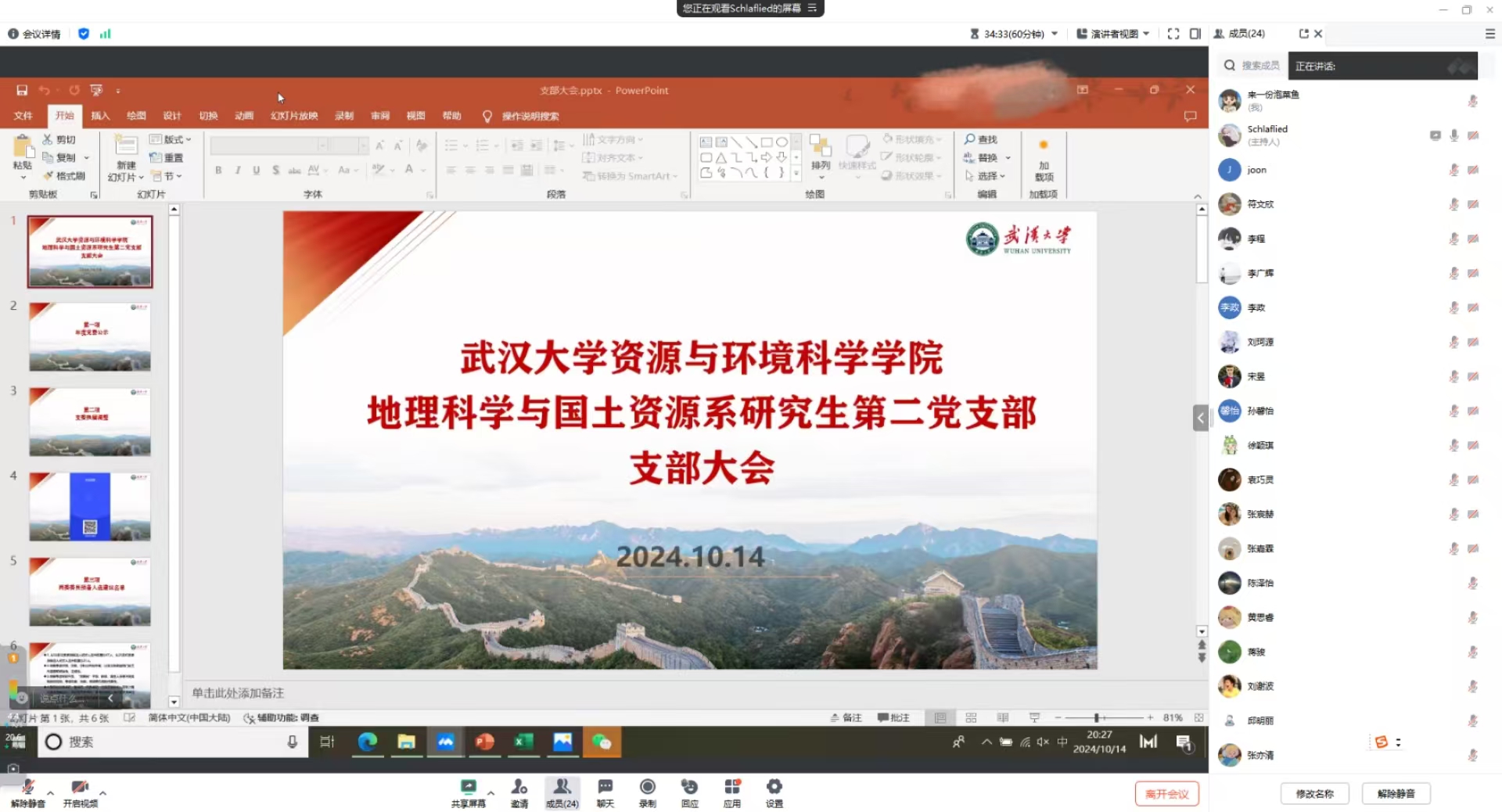 2024年10月14日20:00,地理科学与国土资源系研究生第二党支部于线上召开了支部大会。本次会议由党支部书记许澎同志主持,会议共有三项内容:一是对2023年度中管、省管、校管党费文件进行公示;二是顺利开展了支部委员的换届工作;三是圆满完成了中国共产党91沈先生