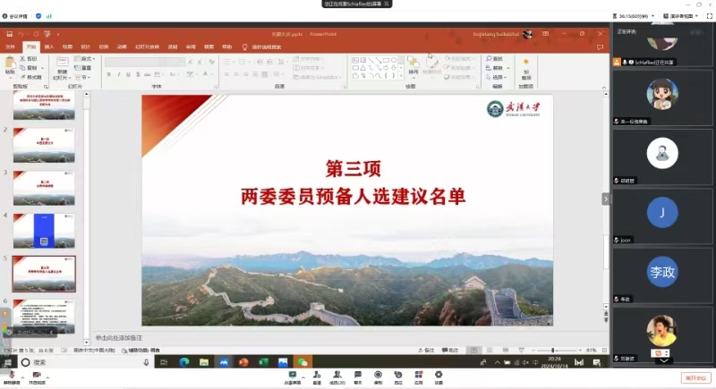 第十次党员代表大会有关工作,并请支部党员进行选举投票选出“两委”委员预备人选。本次采用线上与无记名方式投票表决,由符文欣同学作为监票人,罗波瑾同志作为计票人,共收回19张有效表决票。