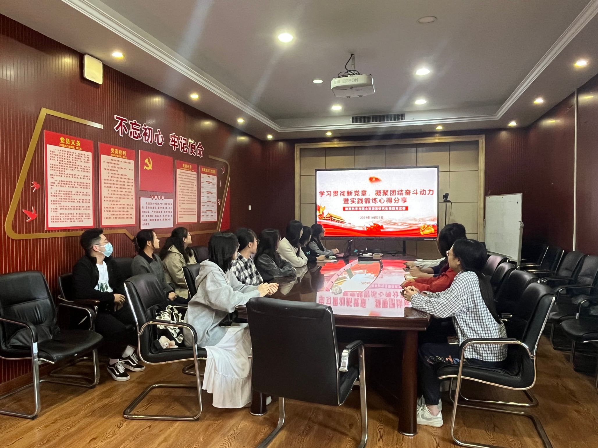 为加强党员党性修养,坚定“永葆对党的无限忠诚”的政治信仰,树立“团结奋进、开辟未来”的精神旗帜,2024年10月23日14:30,地理科学与国土资源系研究生第四党支部在院办504组织学习了“学习贯彻新党章,凝聚团结奋斗动力”十月专题党课, 本次党课由党支部组织委员李雨珊同志领学。会议有两项议程,第一项是“学习贯彻新党章,凝聚团结奋斗动力”专题党课,第二项是“百卅珞珈擎蓝图,奋楫笃行启新程”社会实践锻炼心得分享。