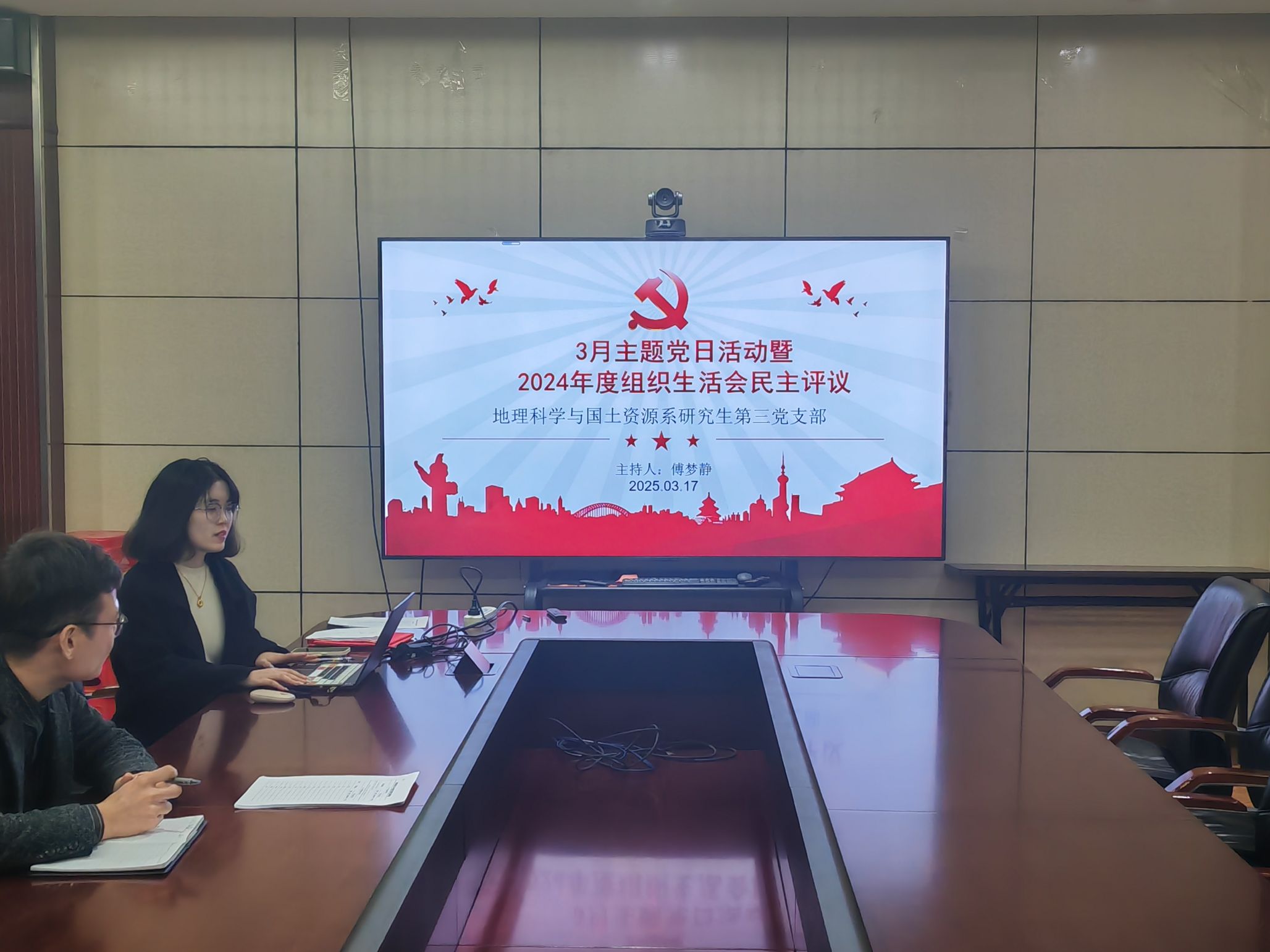 2025年3月17日19:30,地理科学与国土资源系研究生第三党支部于学院320会议室召开3月主题党日活动暨2024年度组织生活会。本次会议由支部书记傅梦静同志主持。