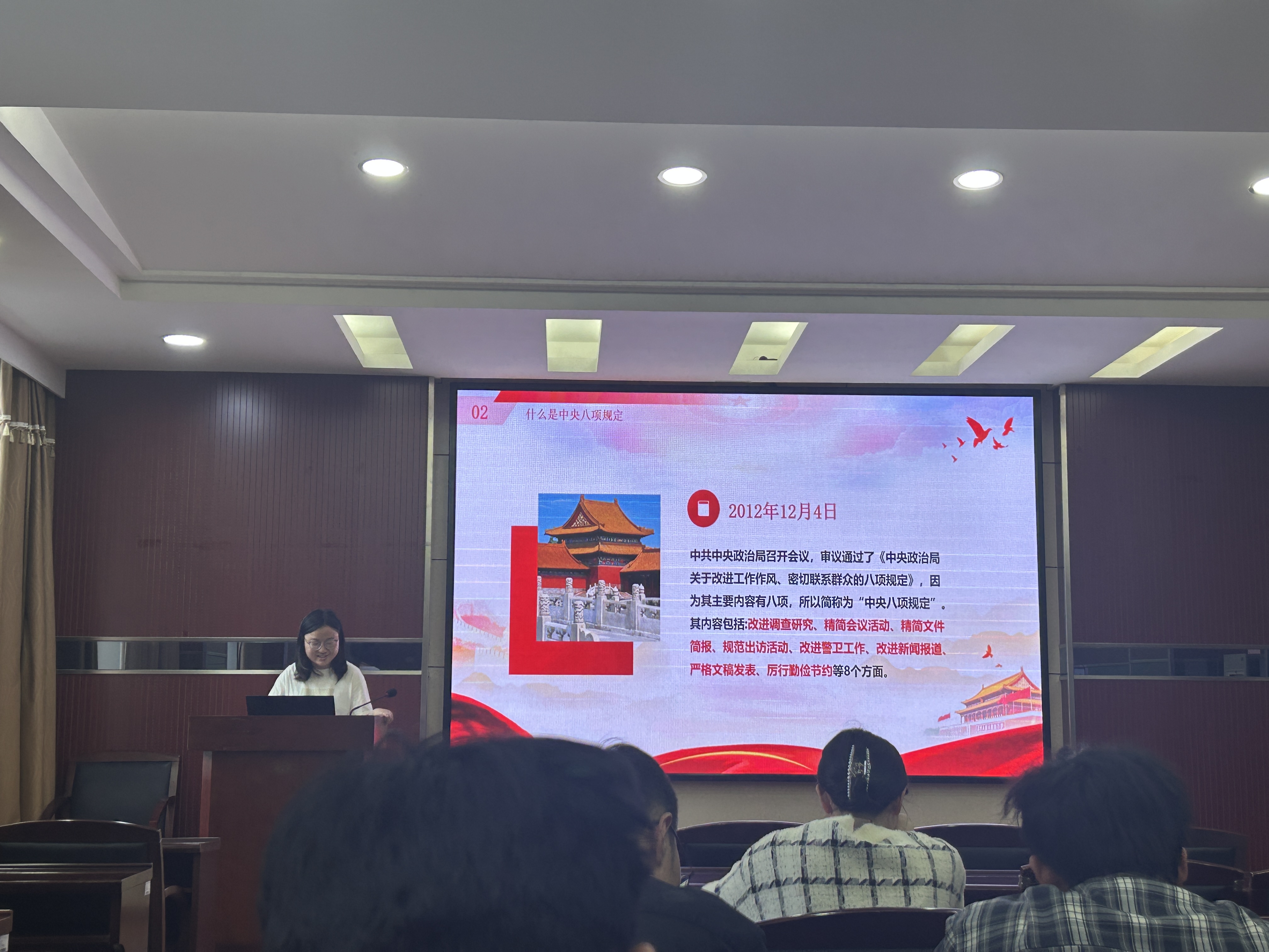 会议第五项,开展四月主题党日活动,深入贯彻中央八项规定精神学习教育。支部书记江乐怡同志从三个方面进行介绍,什么是中央八项规定,什么是中央八项规定精神,八项规定何以深刻改变中国。
