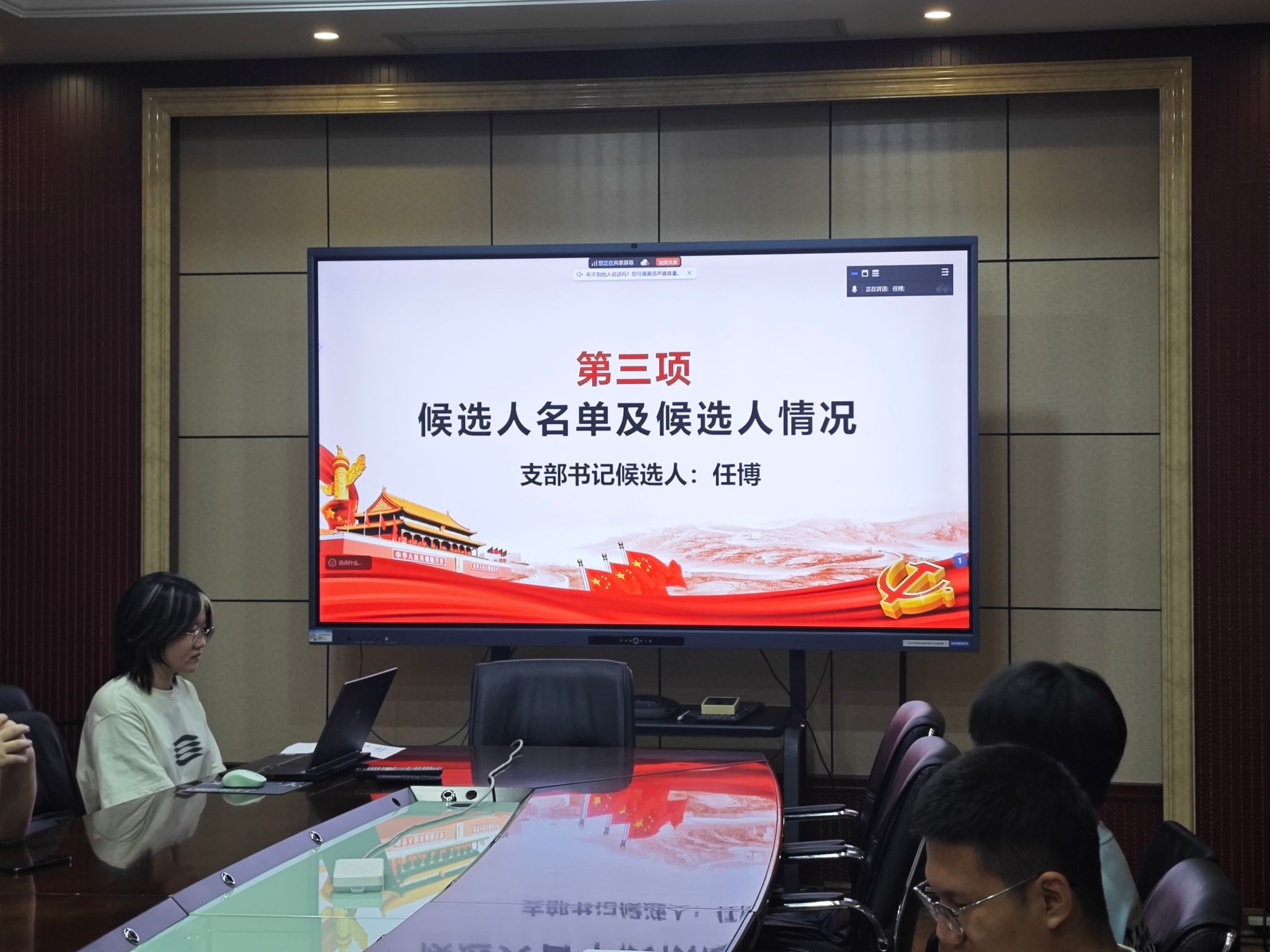 会议第三项,支委调整。王丹同志代表党支部委员会向支部党员大会报告工作。经个人申报与组织审核,王丹同志宣读了候选人名单,任博、周贝贝、任焕博和杨冉茂同志分别进行了竞选发言,由正式党员进行无记名投票并现场公布投票结果。经表决,四位同志均得到了党支部成员的一致认可,任博同志当选为党支部书记,周贝贝同志当选为组织委员,任焕博同志当选为宣传委员,杨冉茂同志当选为纪律委员。