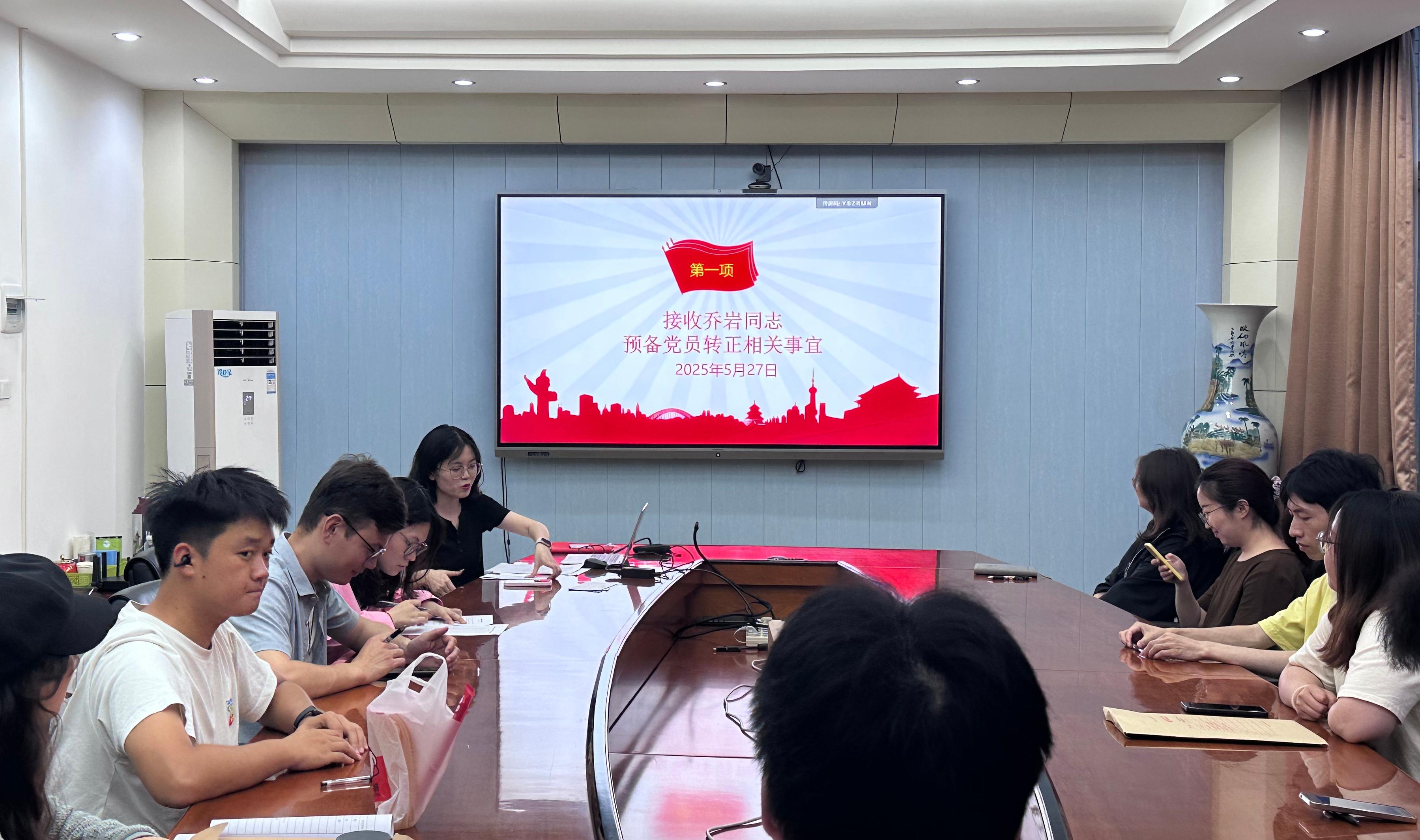 会议第一项,预备党员转正大会。首先由预备党员乔岩同志汇报预备期间的思想、工作情况。培养联系人杨瑞同志对乔岩同志预备期间在理论学习方面取得的进步给予了肯定,并表示同意其按期转正。党支部副书记吴云松同志汇报了乔岩同志预备期间的教育考察情况和支委会对乔岩同志能否转正的意见。与会党员对预备党员乔岩同志能否转正进行充分讨论并发表意见,一致认为乔岩同志在预备期表现优异,同意其按期转正。