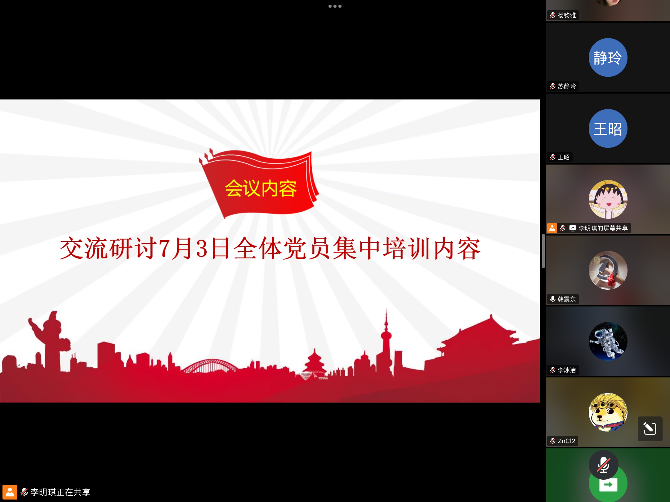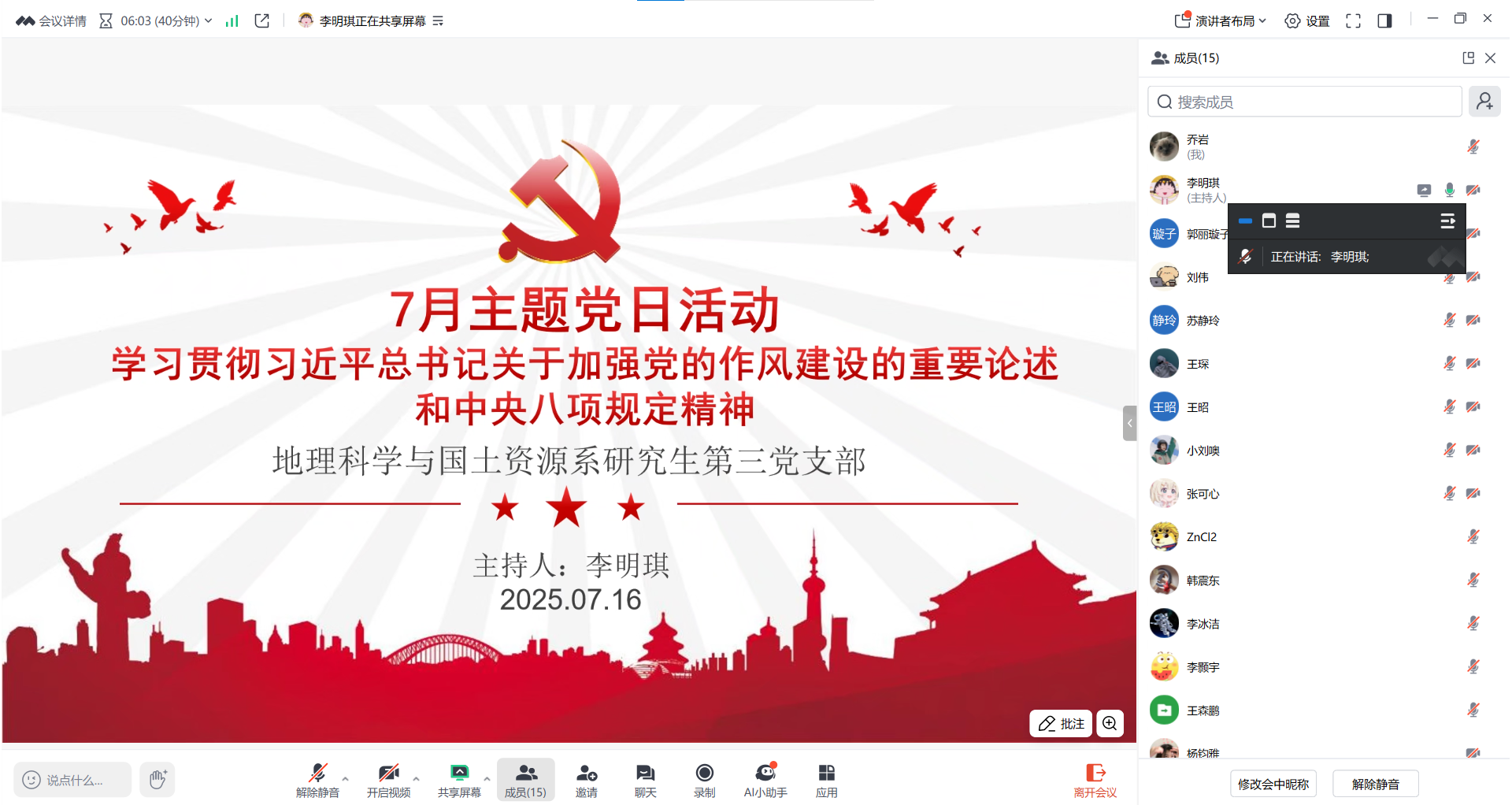 2025年7月16日19:00,地理科学与国土资源系研究生第三党支部于线上召开七月主题党日活动。本次会议由支部书记李明琪同志主持。依据2025年7月3日举办的91沈先生