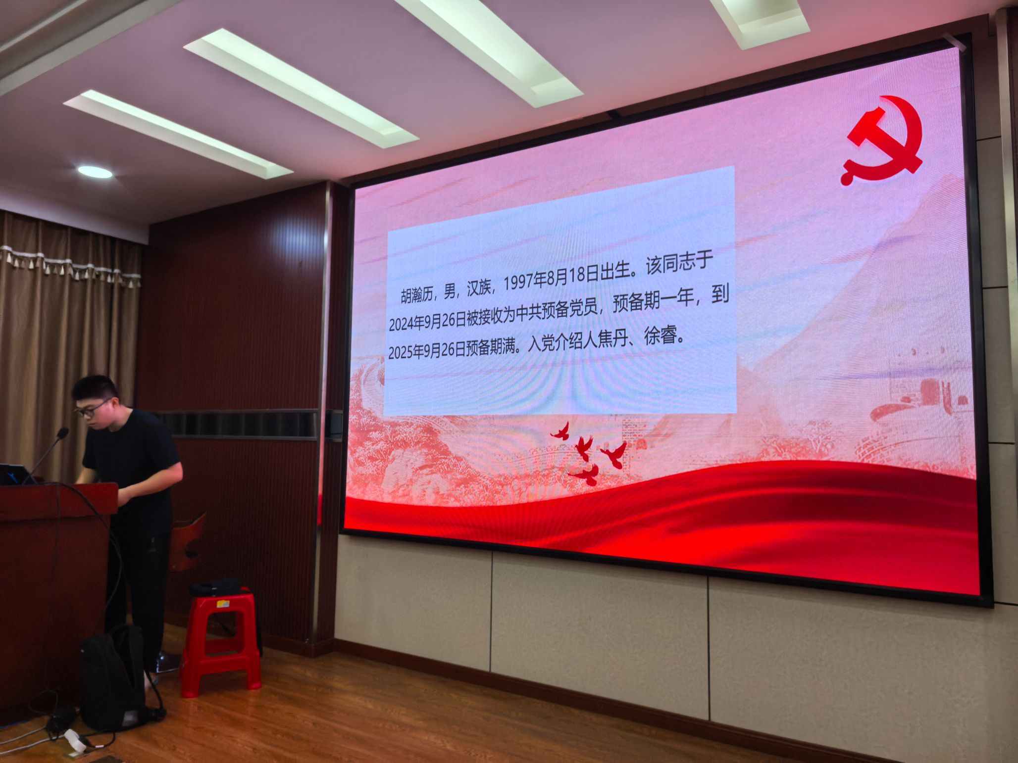 会议第二项,讨论预备党员胡瀚历、褚天佑、罗嘉欣同志的转正申请。三位同志分别向党支部汇报在预备期内的思想情况,介绍了科研学习和生活上的表现并进行总结与反思。接下来,由三位同志的培养考察人汇报考察情况,在政治思想和学习生活中均积极向党组织靠拢,符合正式党员标准。随后,与会党员发表意见,对三位同志的表现给予肯定。