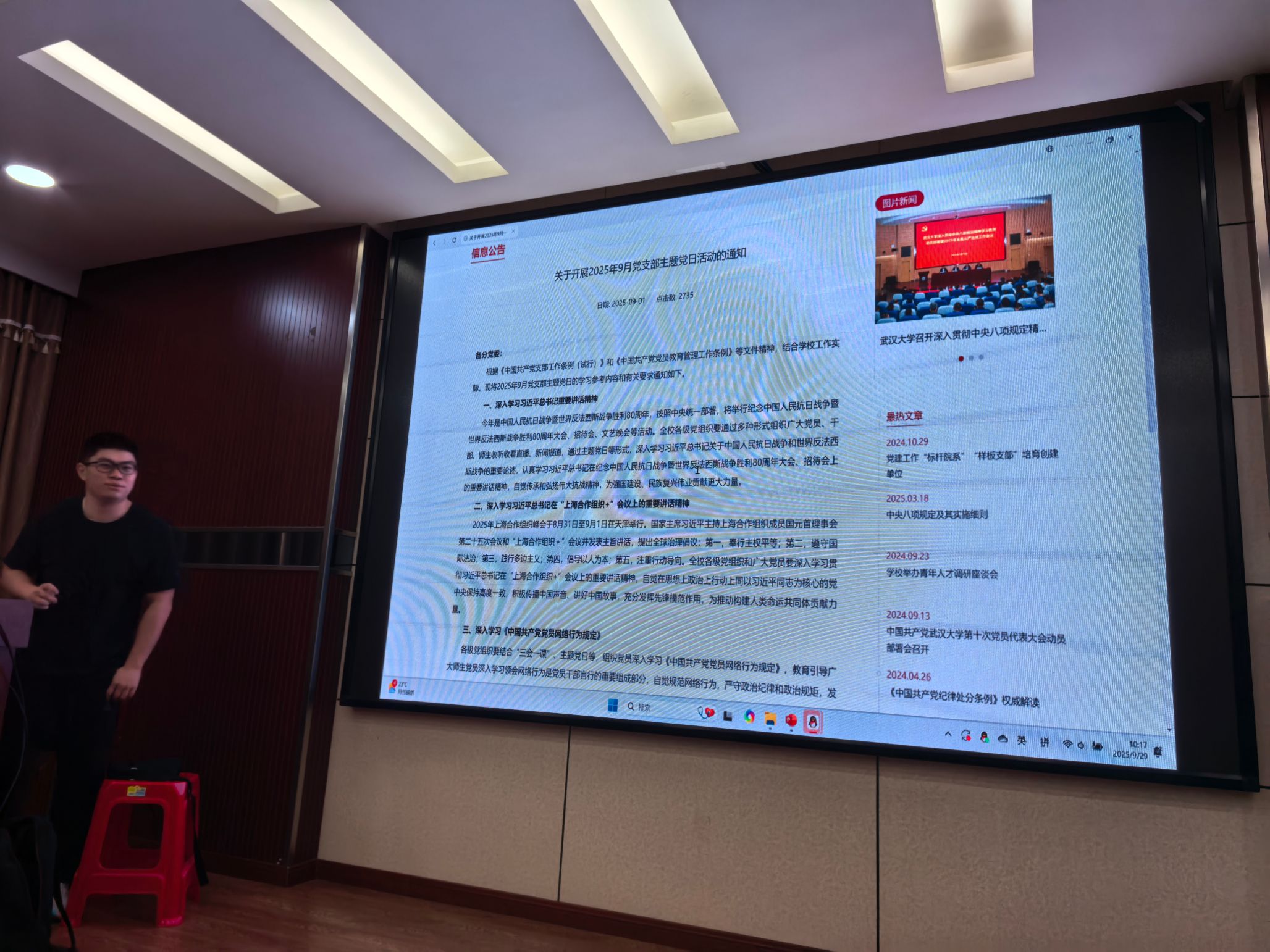 会议第三项,主题党日活动。全体成员聚焦“铭记抗战精神、把握时代脉搏、规范党员言行”主题,深入学习了习近平总书记在纪念抗日战争胜利80周年及“上海合作组织+”会议上的重要讲话精神,并认真研读了《中国共产党党员网络行为规定》与《中国共产党党徽党旗条例》,进一步强化了理论武装和党员的身份意识与责任担当。