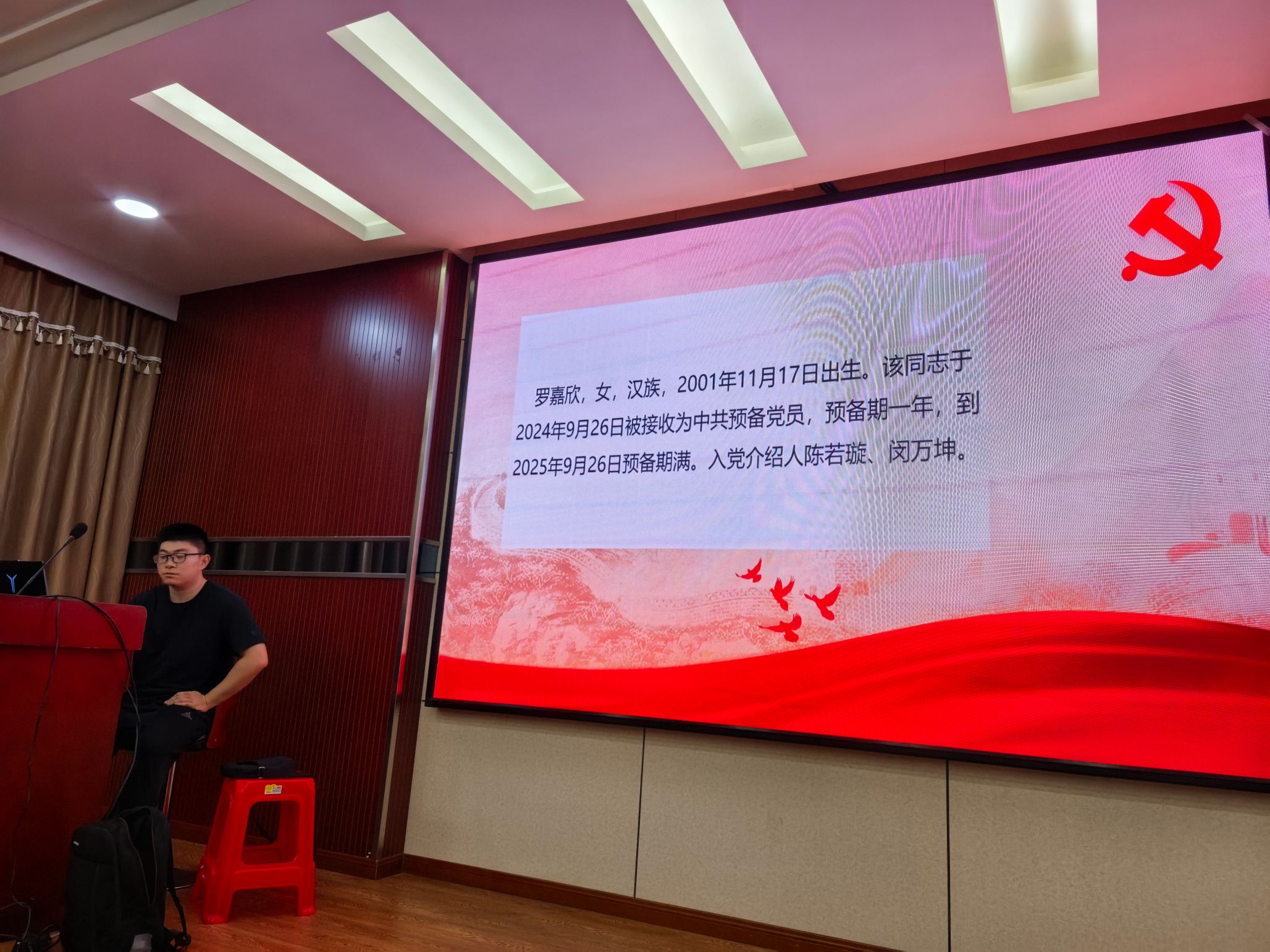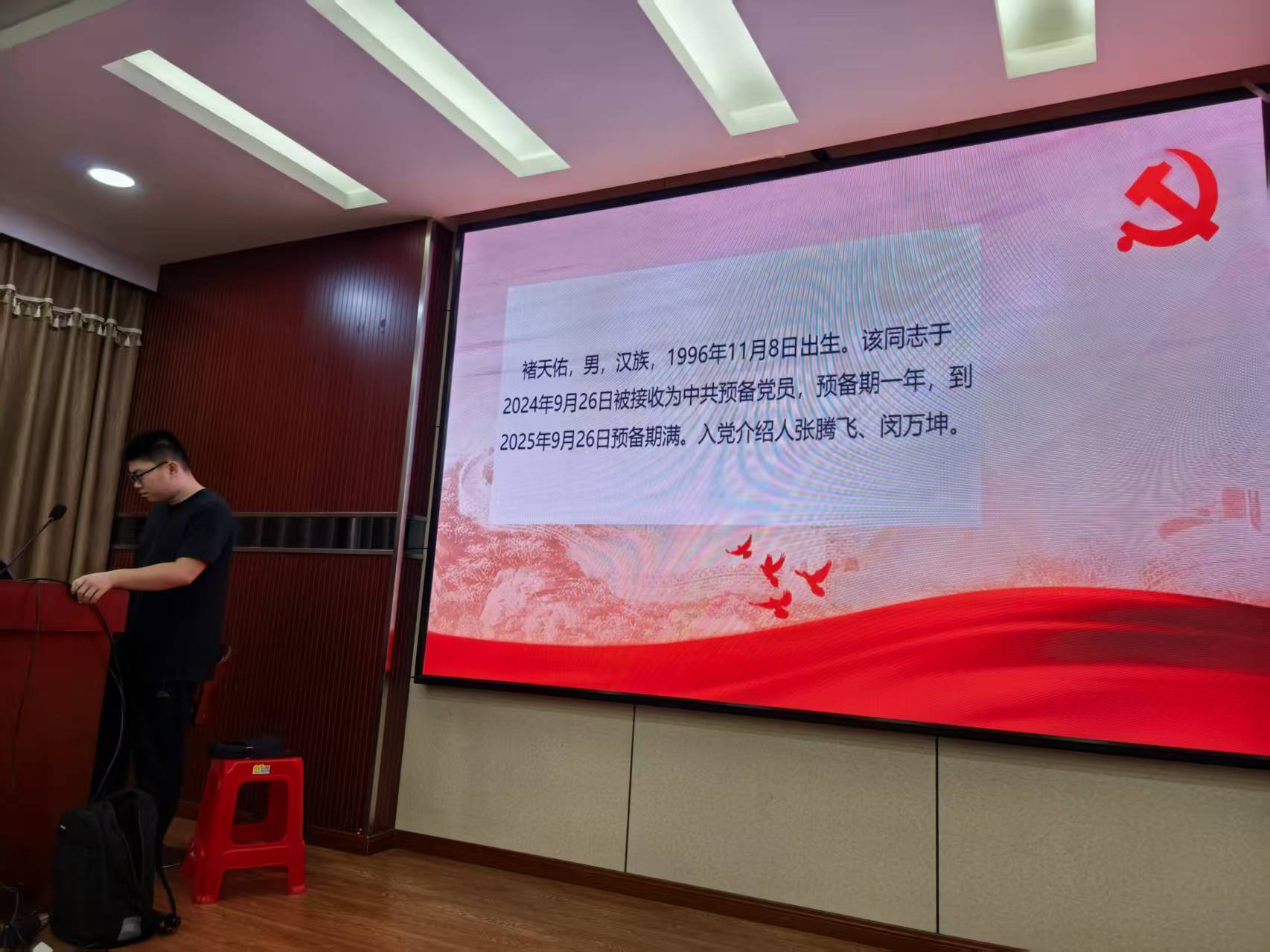 220会议室召开支委调整大会、党员转正大会、主题党日活动。本次会议由党支部书记李铭轲同志主持。本次会议应到正式党员24名,实到正式党员21名,有表决权的到会人数超过应到会有表决权人数的半数,符合规定人数。