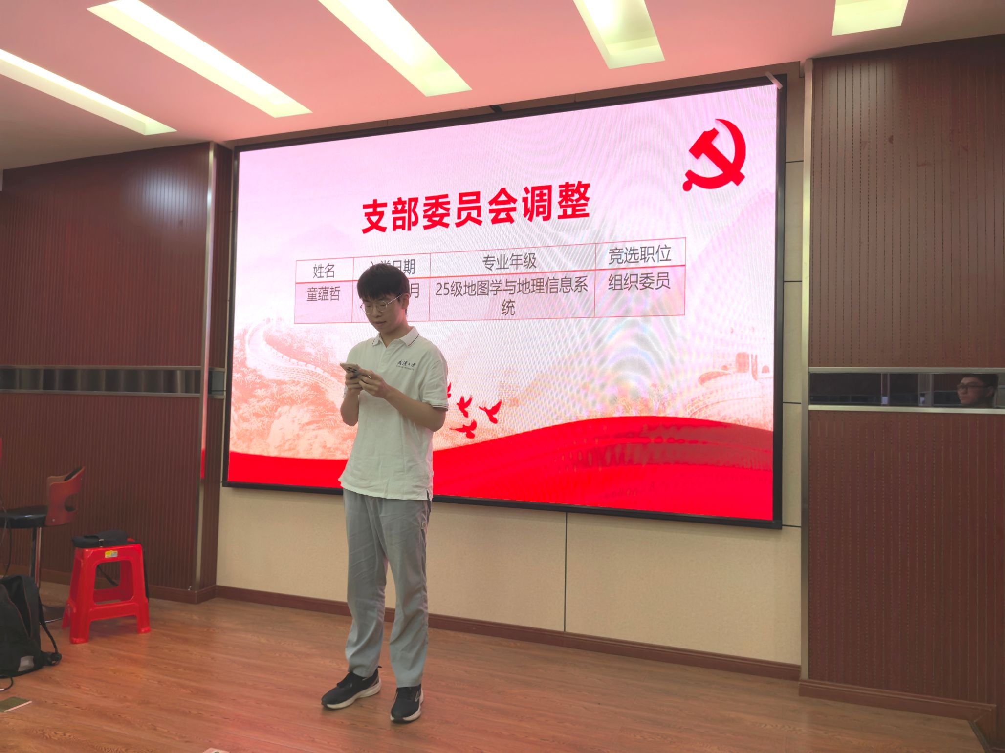 会议第一项,支委调整。经个人申报与组织审核,李铭轲同志宣读了候选人名单,童蕴哲进行竞选发言,由正式党员进行无记名投票并现场公布投票结果,经表决,童蕴哲同志得到了党支部成员的一致认可,当选为组织委员。他表示将继承和发扬党的优良传统和作风,团结协作、锐意进取,为党支部的建设和发展贡献自己的力量。