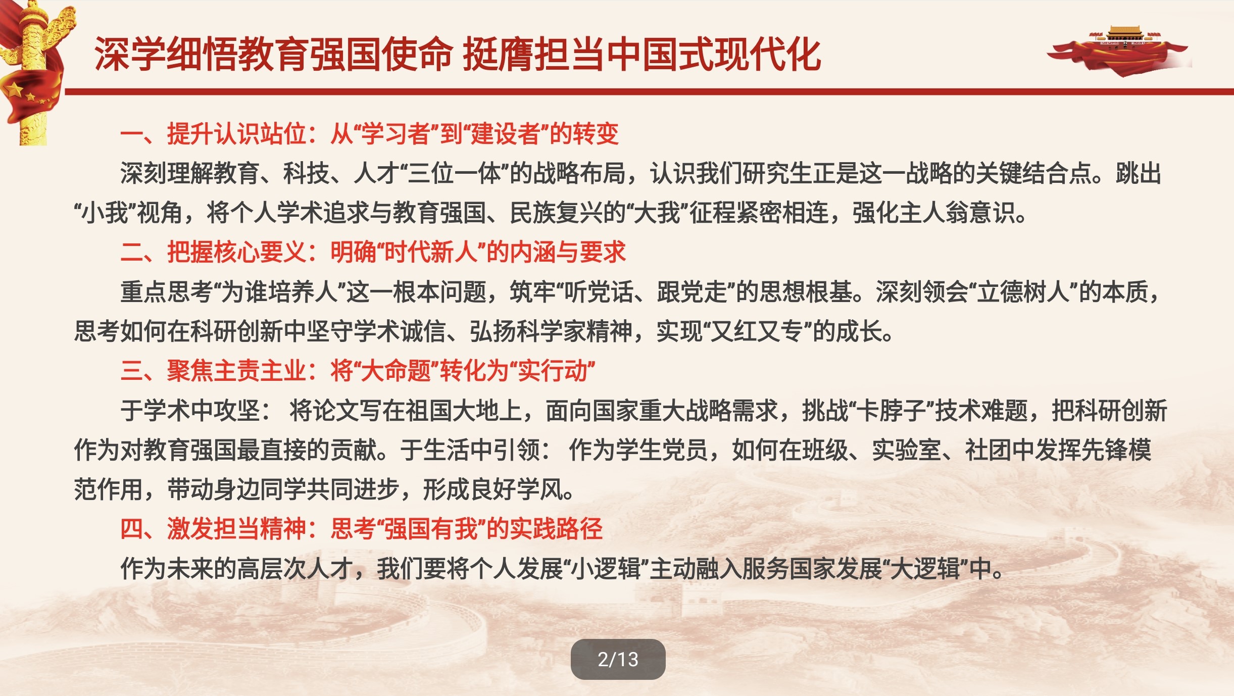 随后,各支部委员依次发表学习感悟。其中,李冰洁同志表示此次集中大课的学习对中国共产党的百年历程有了更鲜活的认识,同时对“中华民族伟大复兴”这个目标有了更具体的感知和更强的信心;刘伟同志表示通过此次集中大课的学习,深刻认识到中华民族伟大复兴进入了不可逆转的历史进程,并对教育强国的基础工程属性有了全面领悟,习近平总书记关于教育的重要论述,为我们青年一代的成长成才指明了方向。刘泽瑾同志指出作为研究生党员,我们我们既是国家教育发展的受益者,更应是矢志不渝的奋斗者,强调研究生党员要能坐得住“冷板凳”,去勇敢探索那些从0到1的原始创新;乔岩同志表示通过参加此次集中大课深刻理解了中国共产党带领中华民族实现伟大复兴的艰辛历程,进一步领悟到了教育的政治属性和时代使命,深刻揭示了培养担当民族复兴大任时代新人的根本任务。任博同志表示,通过集中大课学习,更加深刻地认识到中国共产党在中华民族伟大复兴历史征程中的核心领导作用,进一步坚定了为党和人民事业奋斗的信念。杨冉茂同志谈到,习近平总书记关于教育的重要论述系统阐述了教育在民族复兴中的基础性地位,作为研究生党员,要自觉将个人学术追求融入国家发展大局,努力成为担当民族复兴大任的时代新人。周贝贝同志指出,要深刻把握教育强国的战略意义,立足专业领域,勇于开展原始创新,以实际行动践行“把论文写在祖国大地上”的号召。任焕博同志表示,通过学习更加明确了教育工作的政治属性和时代使命,作为青年党员,要坚定理想信念,锤炼过硬本领,在实现中华民族伟大复兴的征程中贡献智慧与力量。党支部其余党员同志在会后以文字形式进行了学习感悟分享。