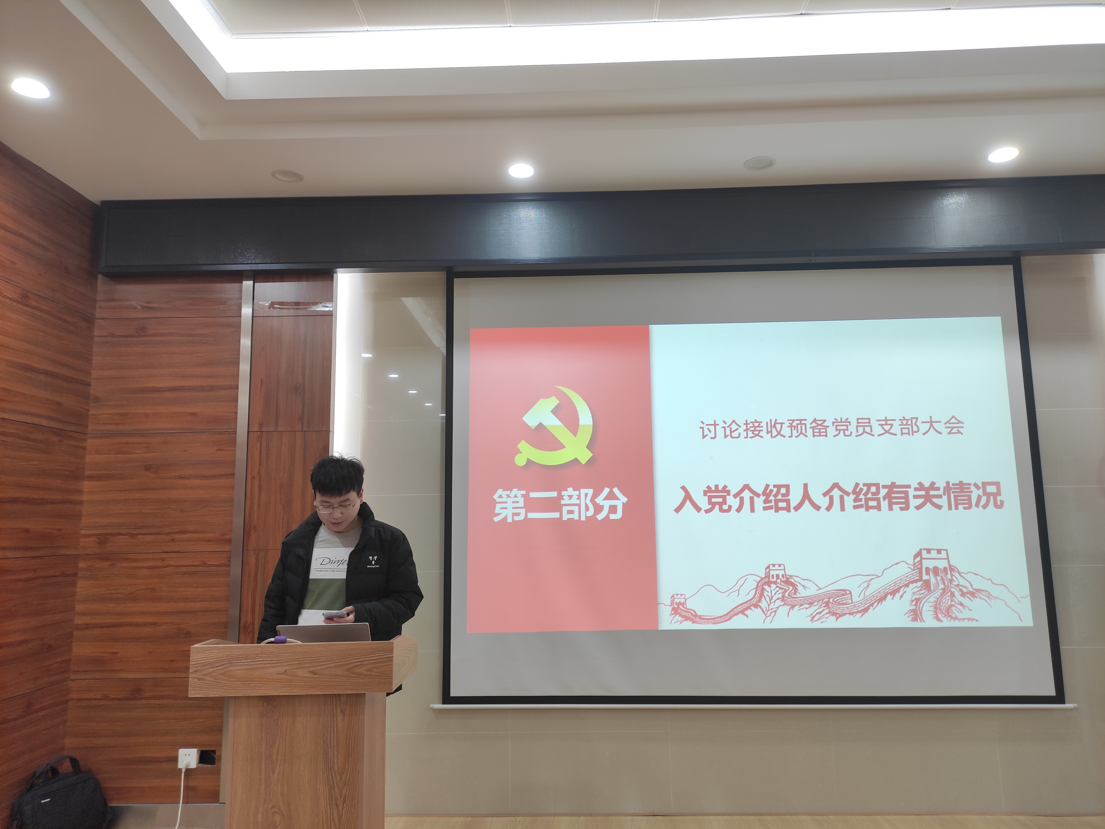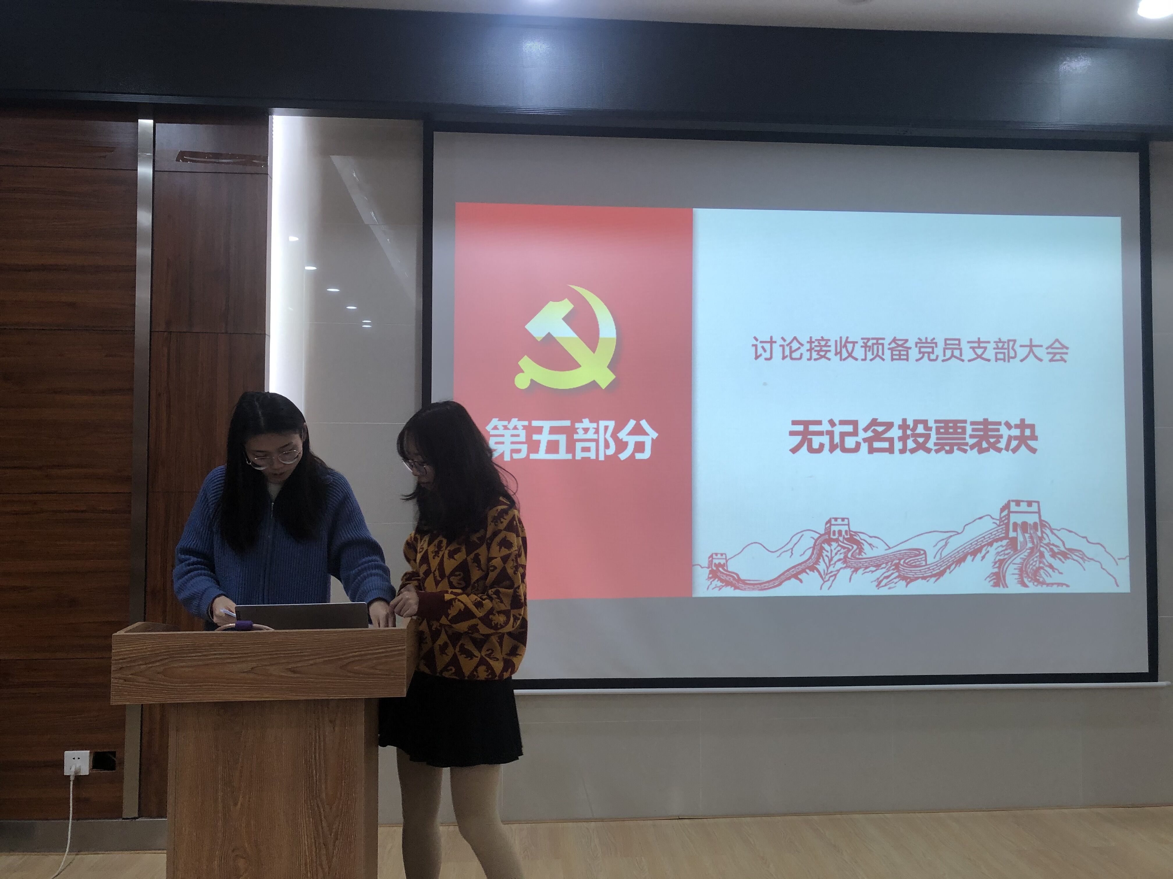 经支部大会讨论,宣传委员赵冲同志和纪律委员冯梅同志分别担任计票人和监票人,支部到场有表决权的12名正式党员进行无记名投票,最终通过一致表决同意接收刘之林同志为预备党员。最后,刘之林同志进行了表态,向党组织表达了自身的想法与决心。支部书记包雨睿同志代表支委会发表意见,希望刘之林同志发展成为预备党员后,不要放松对自己的要求,进一步加强理论学习,努力工作,充分发挥党员的先锋模范作用。
