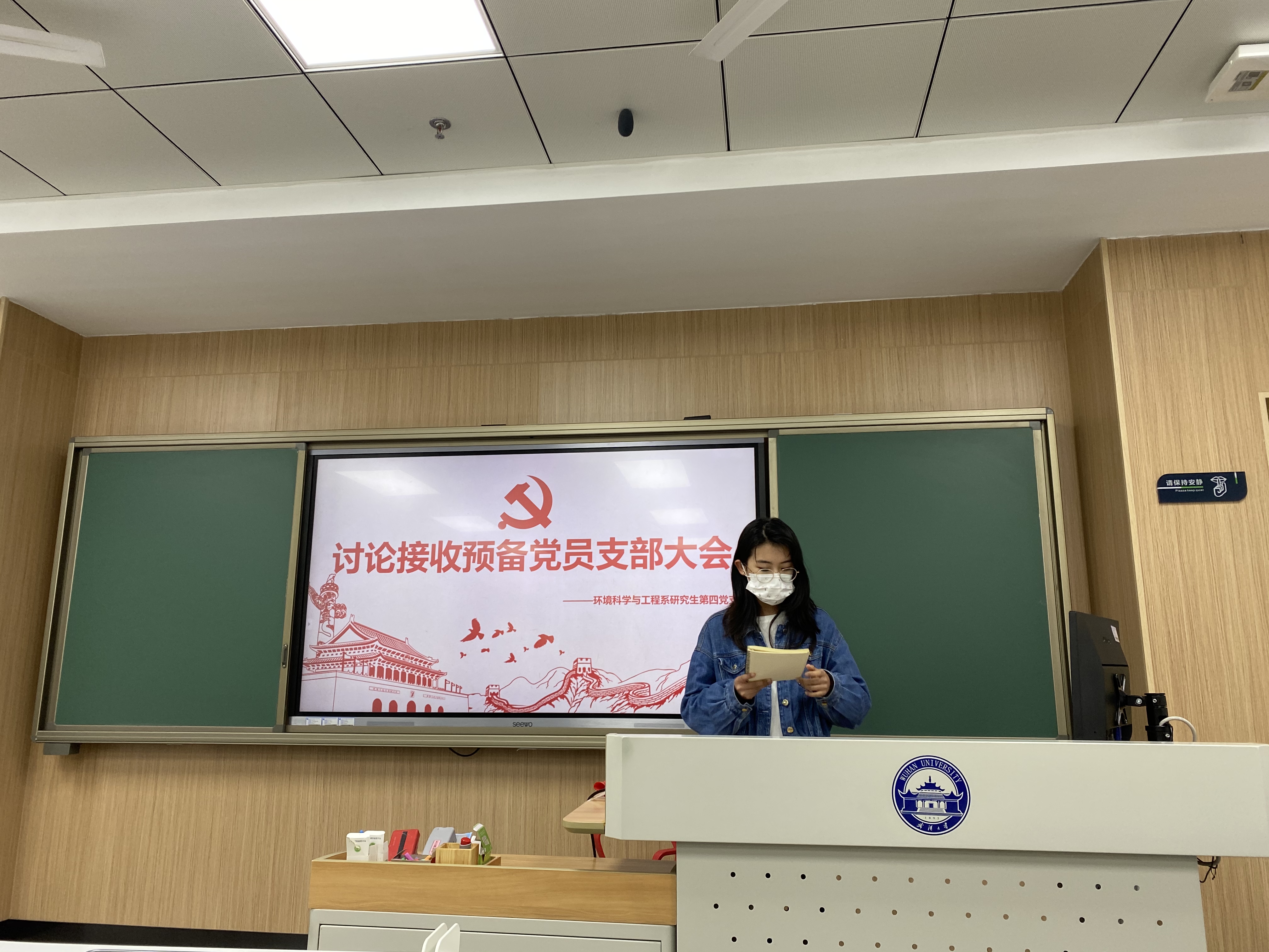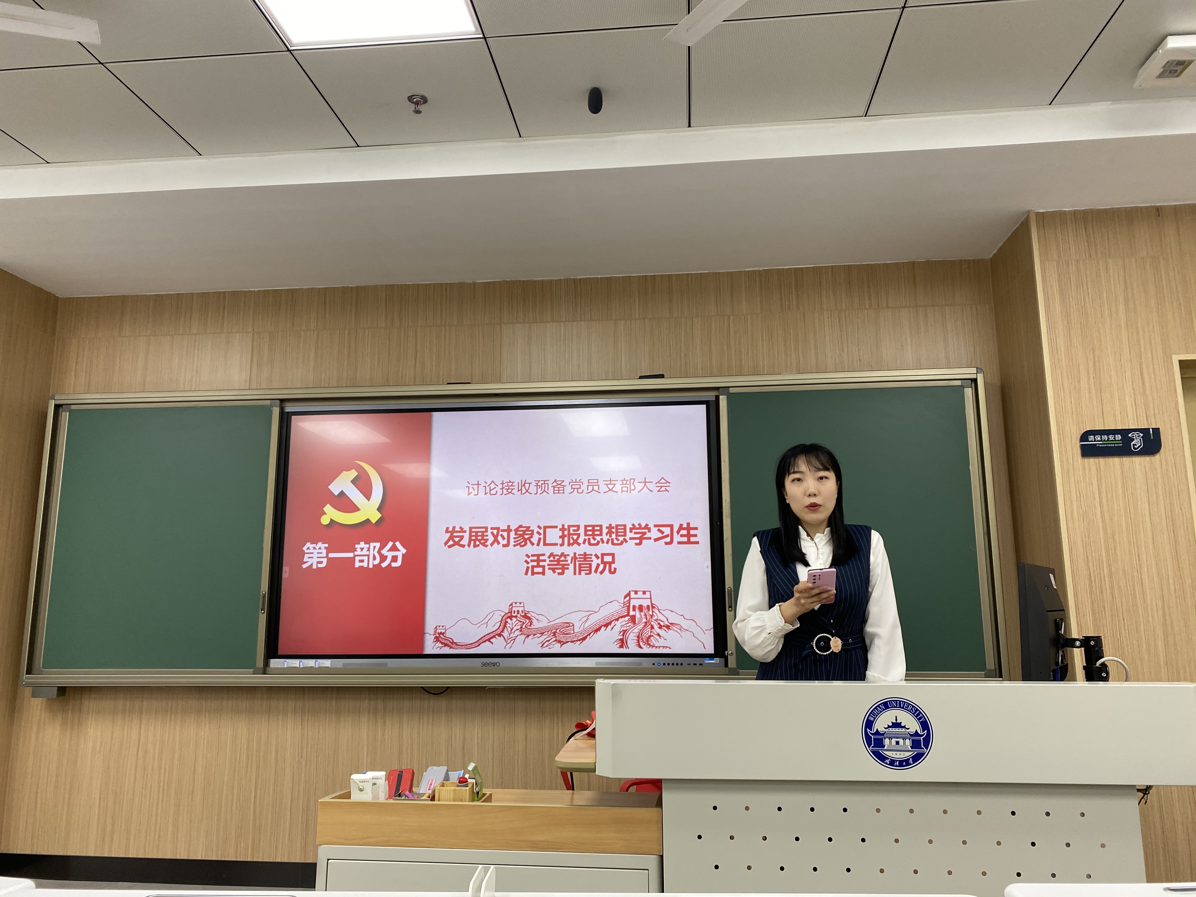 会议严格按照各项程序要求,发展对象庹晓晗汇报对党的认识、入党动机、本人履历及在校表现,以及需要向党组织说明的其他问题。入党介绍人对庹晓晗的思想、学习和生活情况进行了客观公正的评价,一致认为已具备的共产党员的条件。党支部书记王豪杰同志代表支部委员会汇报了庹晓晗同志的审查情况。经表决通过,同意接收庹晓晗同志为中国共产党预备党员。