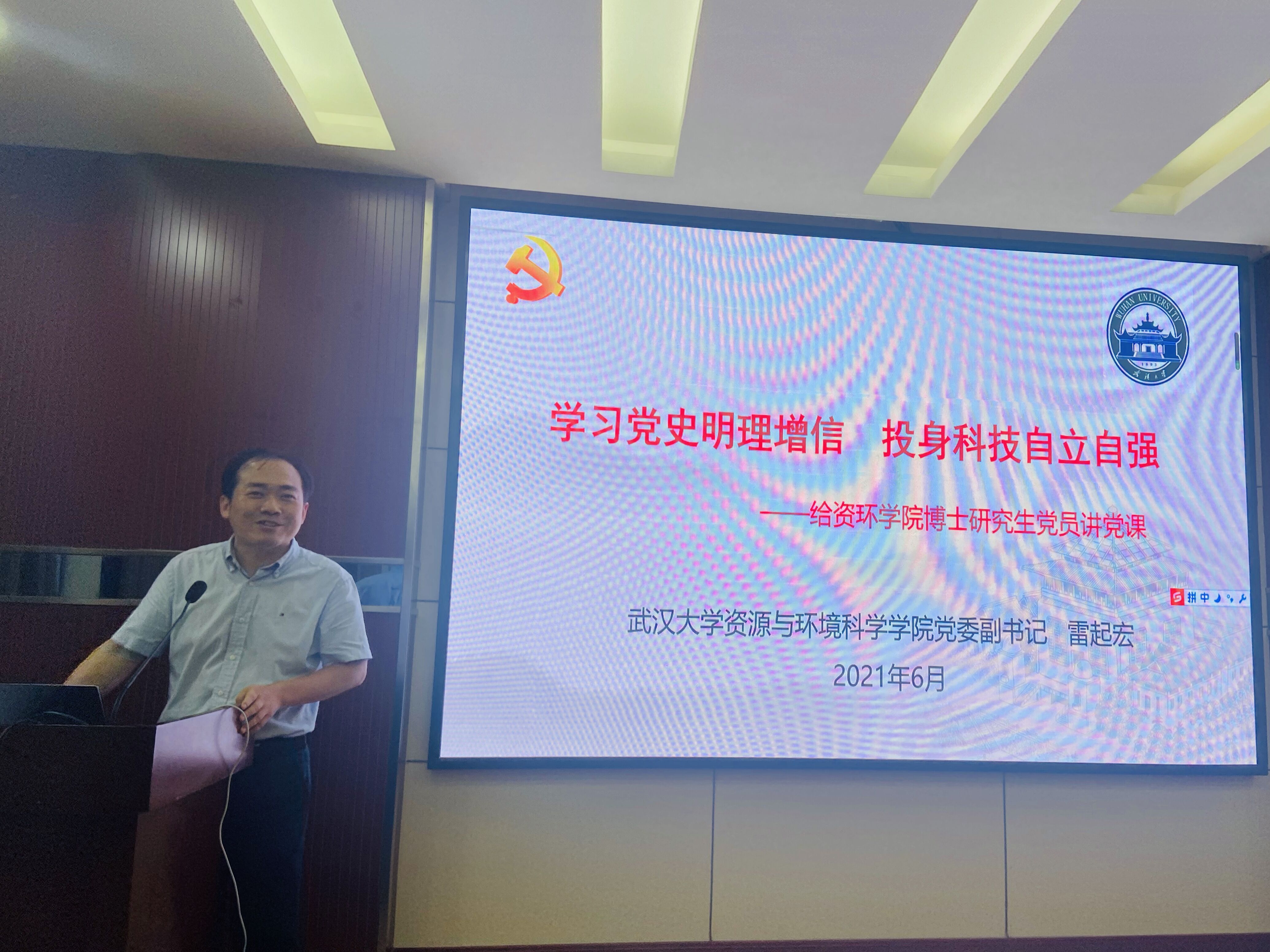学史崇德,学史力行。雷起宏老师立足学院、学科,提出作为博士生如何将理论联系实际落到实处,如何将先辈的实践创造和历史经验启迪智慧、砥砺品格。博士生普遍处于压力较大的状态,须及时疏解,学党史有助于开阔眼界,提升格局,不过沧海一粟须弥芥子,我们经历的痛苦不及革命先辈万一。新时代的号角已经吹响,科技革命席卷全球,资环院既有强大的科技支撑,又有拔尖的后进人才,博士生要立足平台,既要在科技革命中勇立潮头,敢为人先,也要保有踏踏实实,勤学苦干的老黄牛精神,做祖国长盛发展的中坚力量。