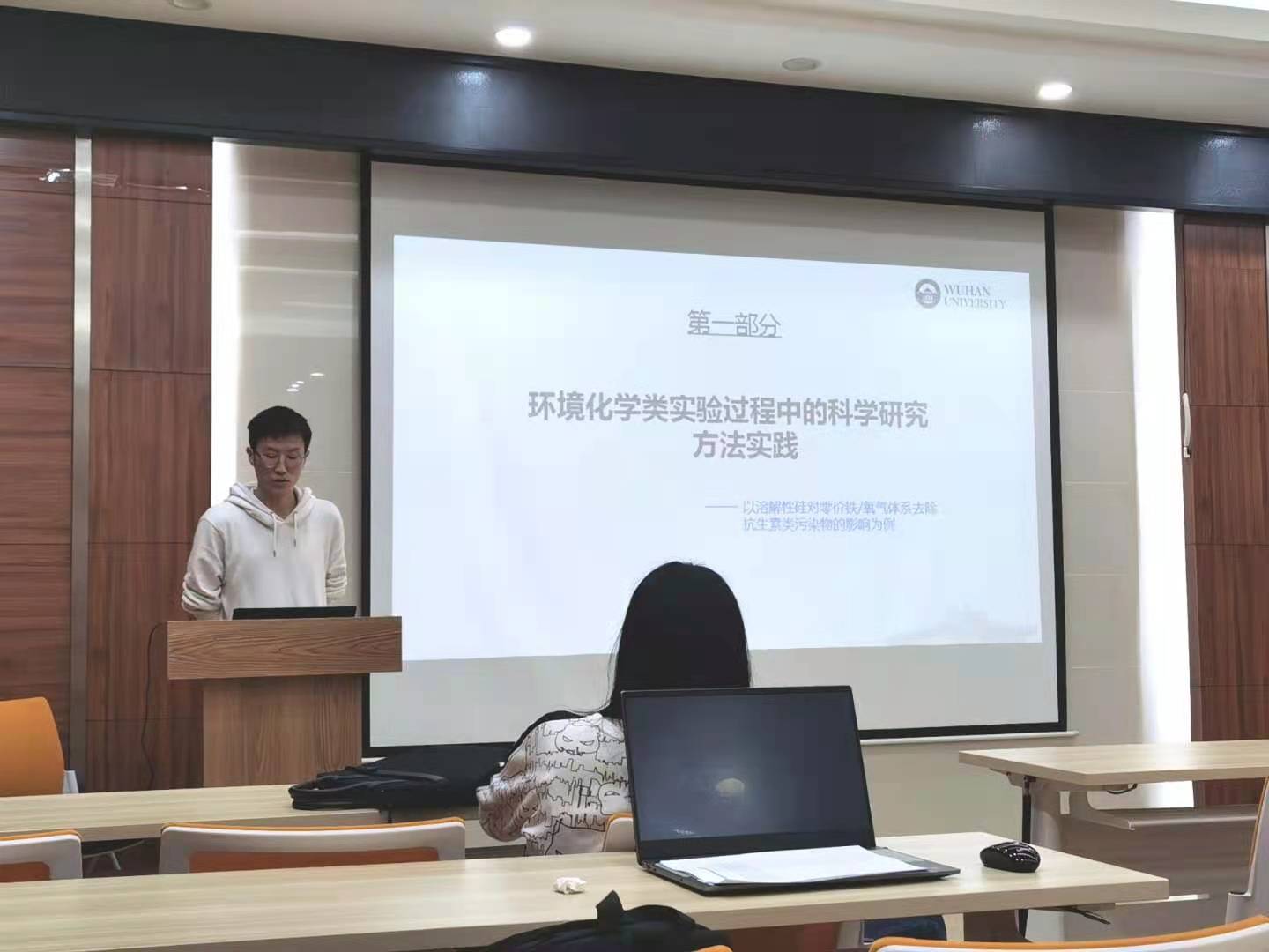 会议第一项,崔佳鑫同志在此次活动中以“溶解性硅对零价铁/氧气体系去除抗生素类污染物的影响”为例分享了自己在环境化学实验过程中的科学研究方法实践,为大家总结了科研中有益的方法和心得;并且以自己的留学经历,为大家讲解了留学申请的详细程序和注意事项,针对大家提出的相关问题进行了详细解答。