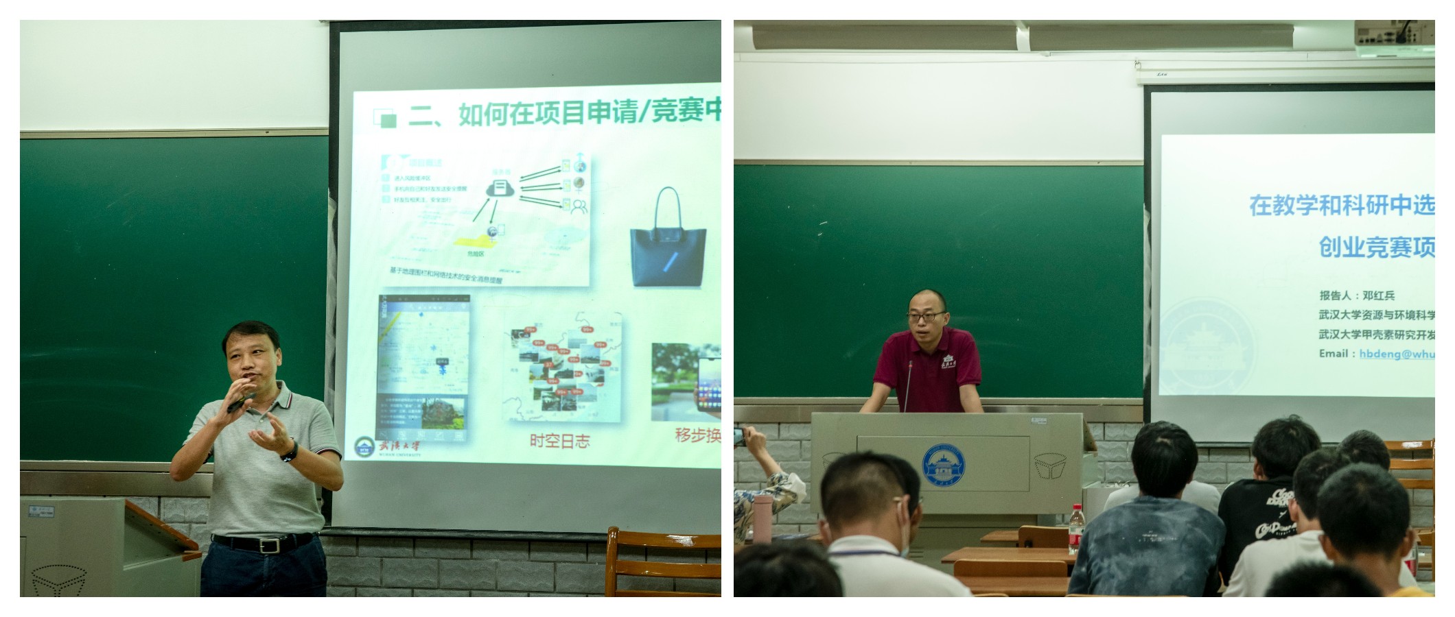 启动仪式后,学院进行了大学生“走进科研”系列活动之教授讲座。教授讲座由蔡忠亮和邓红兵两位创新创业导师主讲。两位导师的讲座题目分别为“在教学和科研中选育大学生创业竞赛项目”和“大学生科研项目立项的几点思考”。邓老师主要是从教学与科研引导、项目与团队选育、机会选择与识别、成果获取等方面教大家如何从老师的重大科研项目中去孵化培育创新创业项目。蔡忠亮老师从历届创新创业训练指导体会引入,告知学生如何在项目申请中获得成功,强调坚持的重要性,并要掌握项目/竞赛的流程,在科研活动中不断创新,最后通过大量案例生动、直观地展示了大学生科研活动。